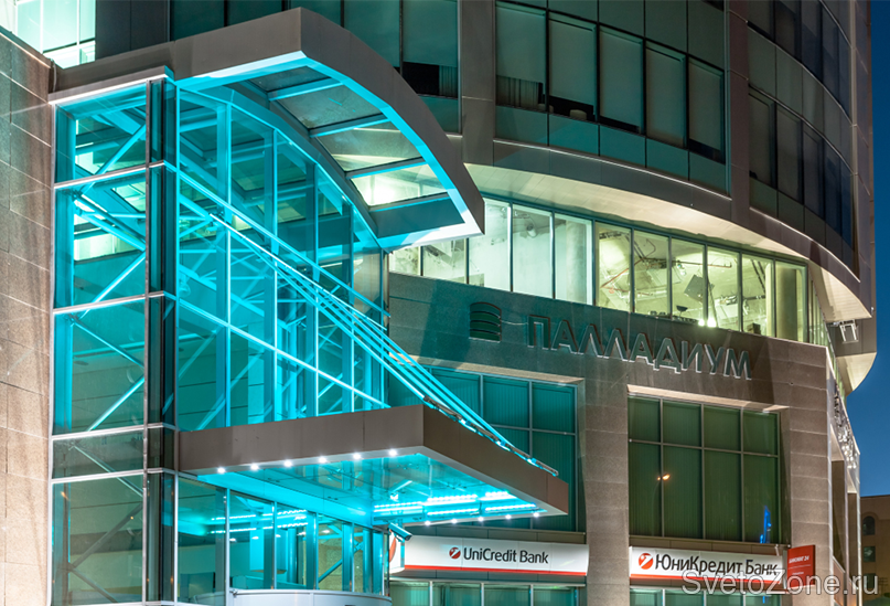 Нижняя часть здания очень важна при восприятии с ближних ракурсов, поэтому его периметр выделен за счет акцентного освещения с помощью встроенных в грунт светильников Gioi и светодинамического освещения входной группы, которая реализована на светодиодных светильниках IntiLINE RGB.