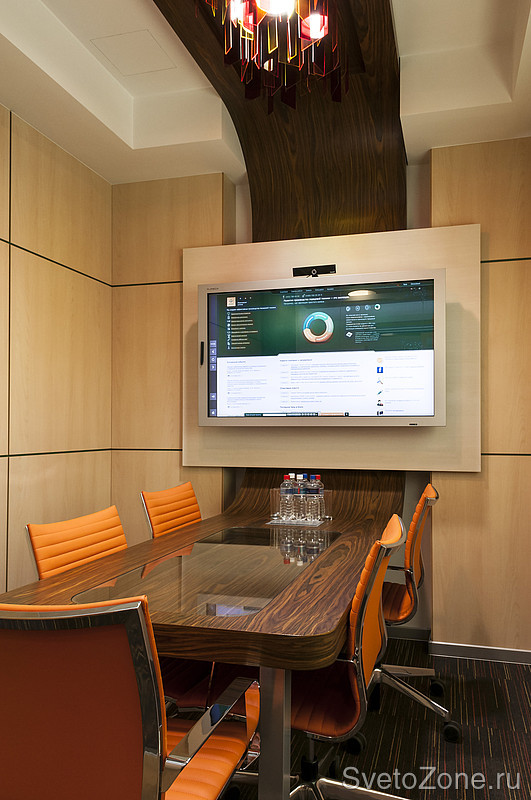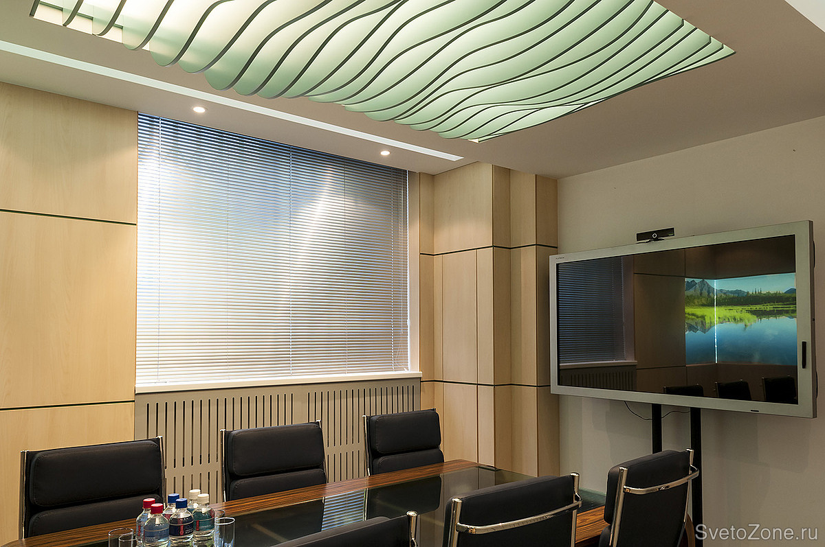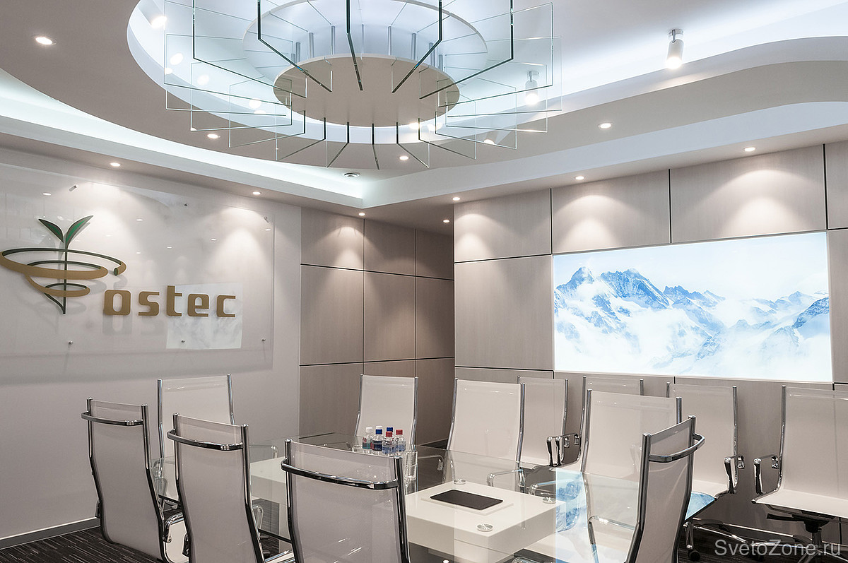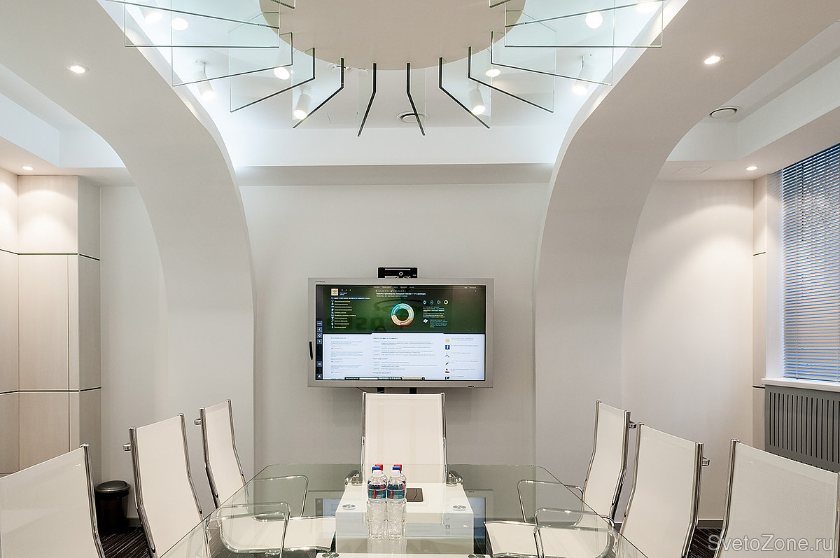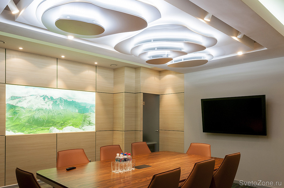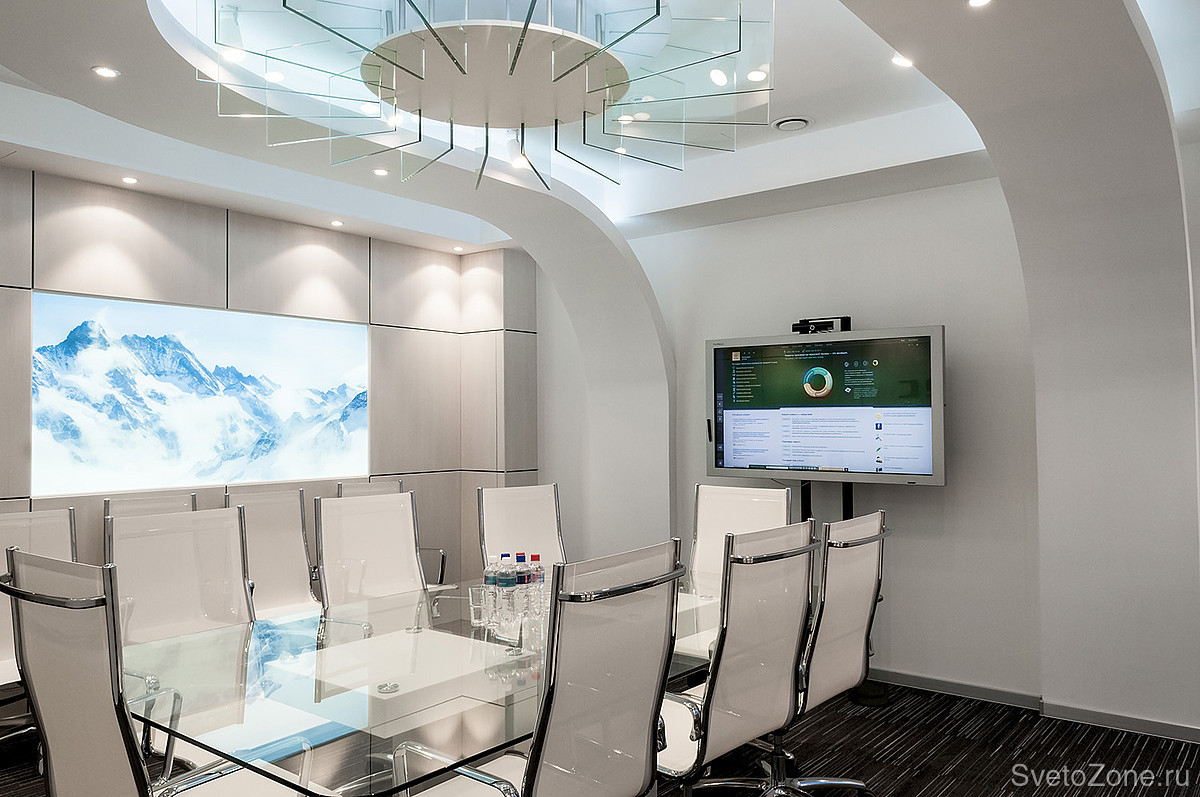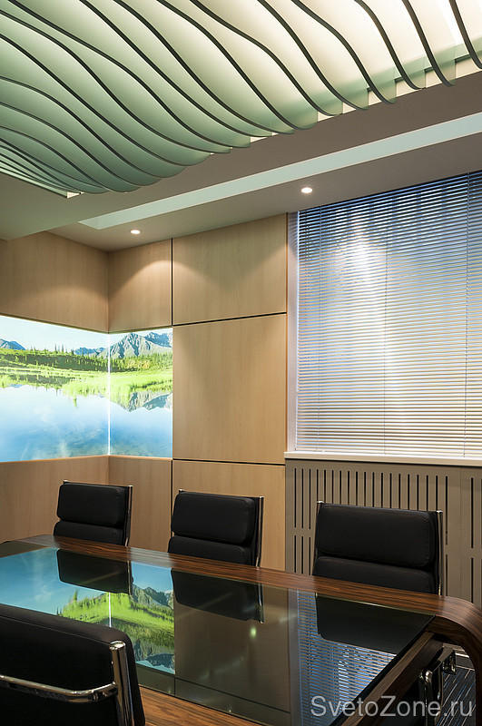 Особым украшением и отличительным знаком всего проекта являются сложные многоуровневые потолки. Ни в одном помещении переговорных и общественных зон форма потолка не повторяется. Для осуществления разработанной концепции архитекторов и достижения необходимого эффекта, необходимо было тщательно продумать проект освещения. |