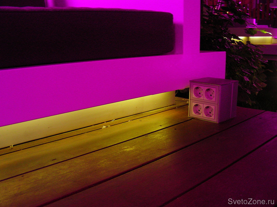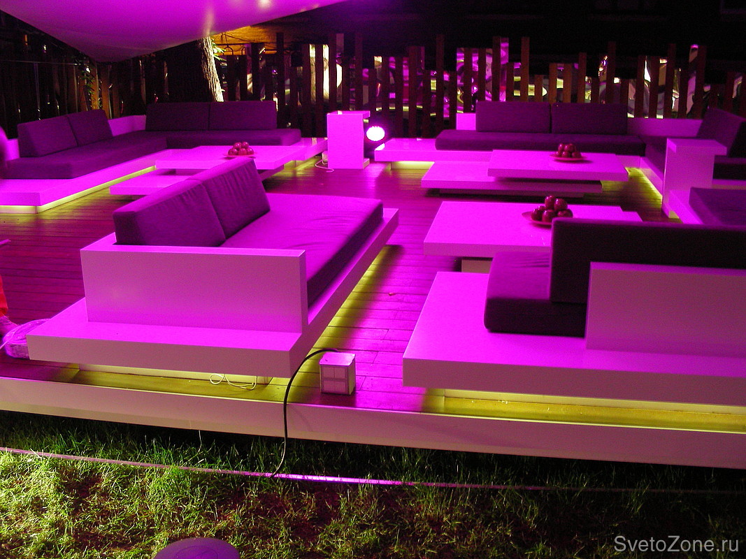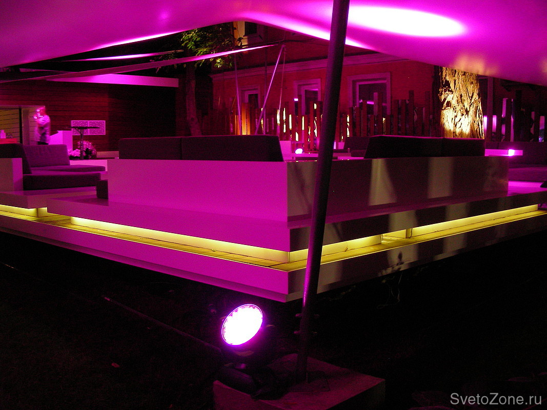 Как вы можете заметить, используется два типа светодиодной подсветки: заливающий и скрытый контурный. Динамические светодиодные прожекторы работают в натянутый над терассой тент.