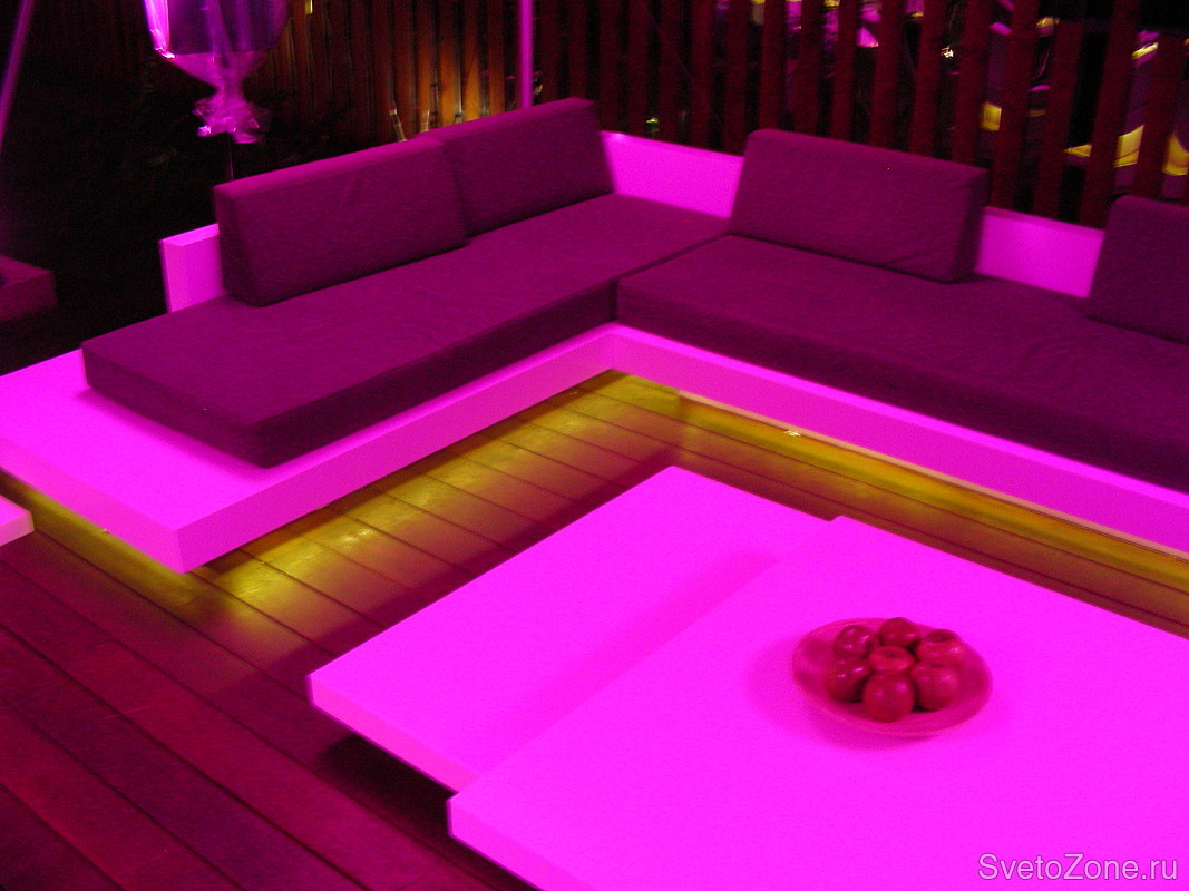 Светодиодная лента установлена по контуру всех диванов. Благодаря этому создается эффект как бы парящей мебели |