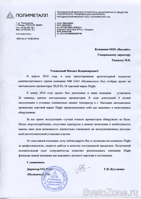Компания «Икслайт» получила благодарственное письмо по реализованному проекту освещения административного здания МФ ОАО «Полиметалл» в Магадане.