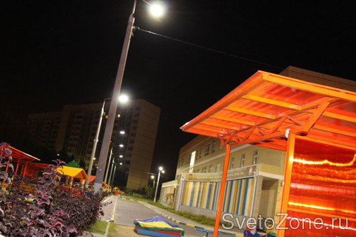 Так, в г.Фрязино в новом детском садике №14 на ул. Проезд Десантников, в наружном освещении применили серию УСС 90 Магистраль. Светильники размещены на опорах освещения вдоль всей территории детского сада и при потреблении всего в 90 ватт, обеспечивают необходимую освещенность.