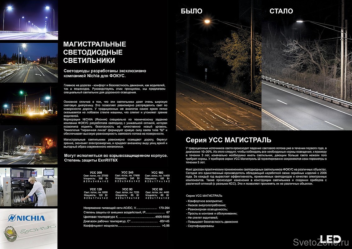 В серии УСС Магистраль применяются светодиоды NICHIA (Япония), с технологией первичная линза. С помощью данной технологии, светильники обеспечивают равномерное светораспределение на поверхности и комфортный спектр излучения.
