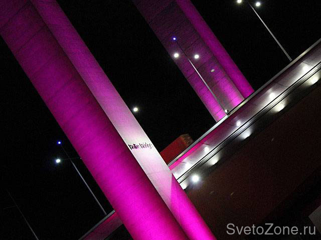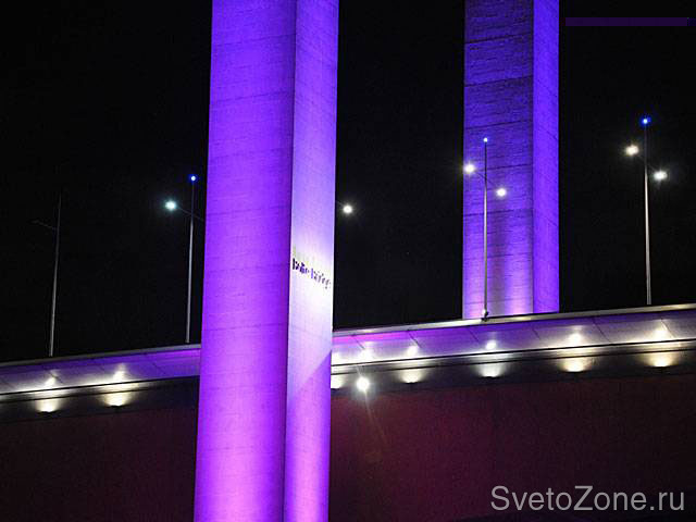 По результатам проведенных натурных испытаний на объекте (макетирования) было принято решение о замене 42 мощных металлогалогенных прожекторов на 36 светодиодных прожекторов GRIVEN POWERSHINE MK2 D RGBW. Приборы смонтированы на специально разработанных конструкциях у основания каждого из П-образных пилонов, и оснащены комбинацией оптических групп с узким и средним углом луча. Подобное сочетание вторичной оптики позволило добиться равномерного распределения светового потока по всей длине поверхности пилона и обеспечило высокий уровень освещенности.