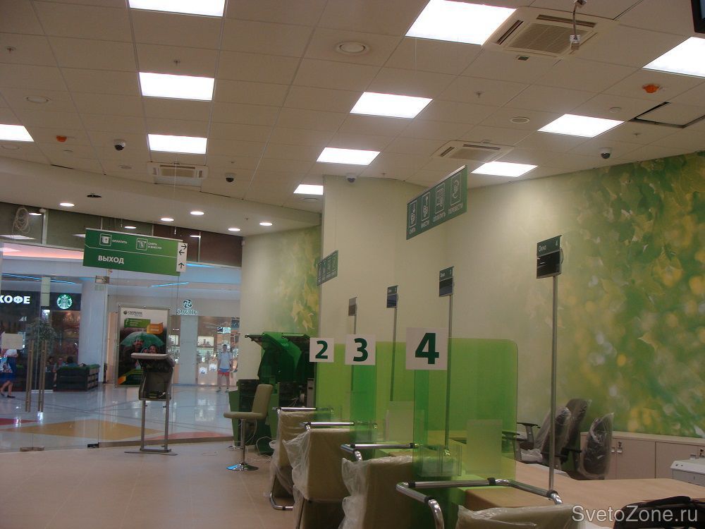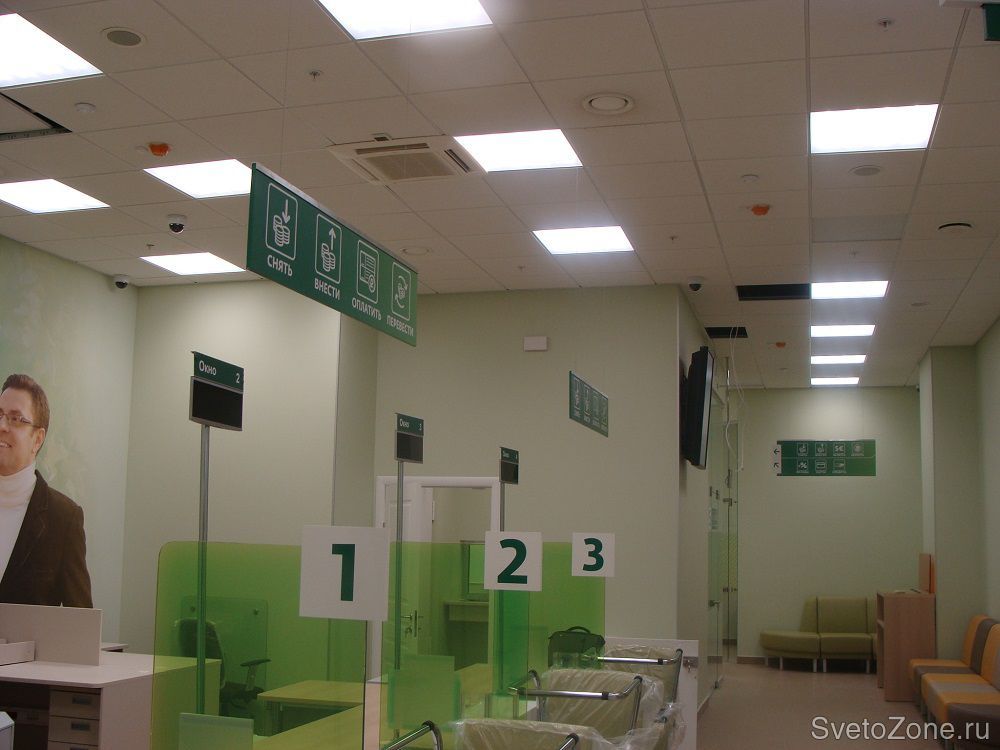 Оптимальным решением для освещения помещений "Сбербанка" стали хорошо себя зарекомендовавшие светодиодные встраиваемые светильники серии "ОФИС".