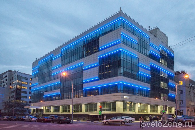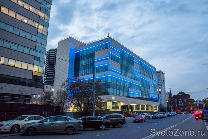 Основная часть фасада здания выполнена из стекла, поэтому технически оправданным решением стало использование светодиодных светильников серии IntiTUBE для контурного освещения. Они идеально подходят для стеклянных фасадов, создают яркие световые линии, хорошо заметные издалека и подчеркивающие геометрию фасада. В общей сложности для проекта было изготовлено более 400 светильников IntiLED.