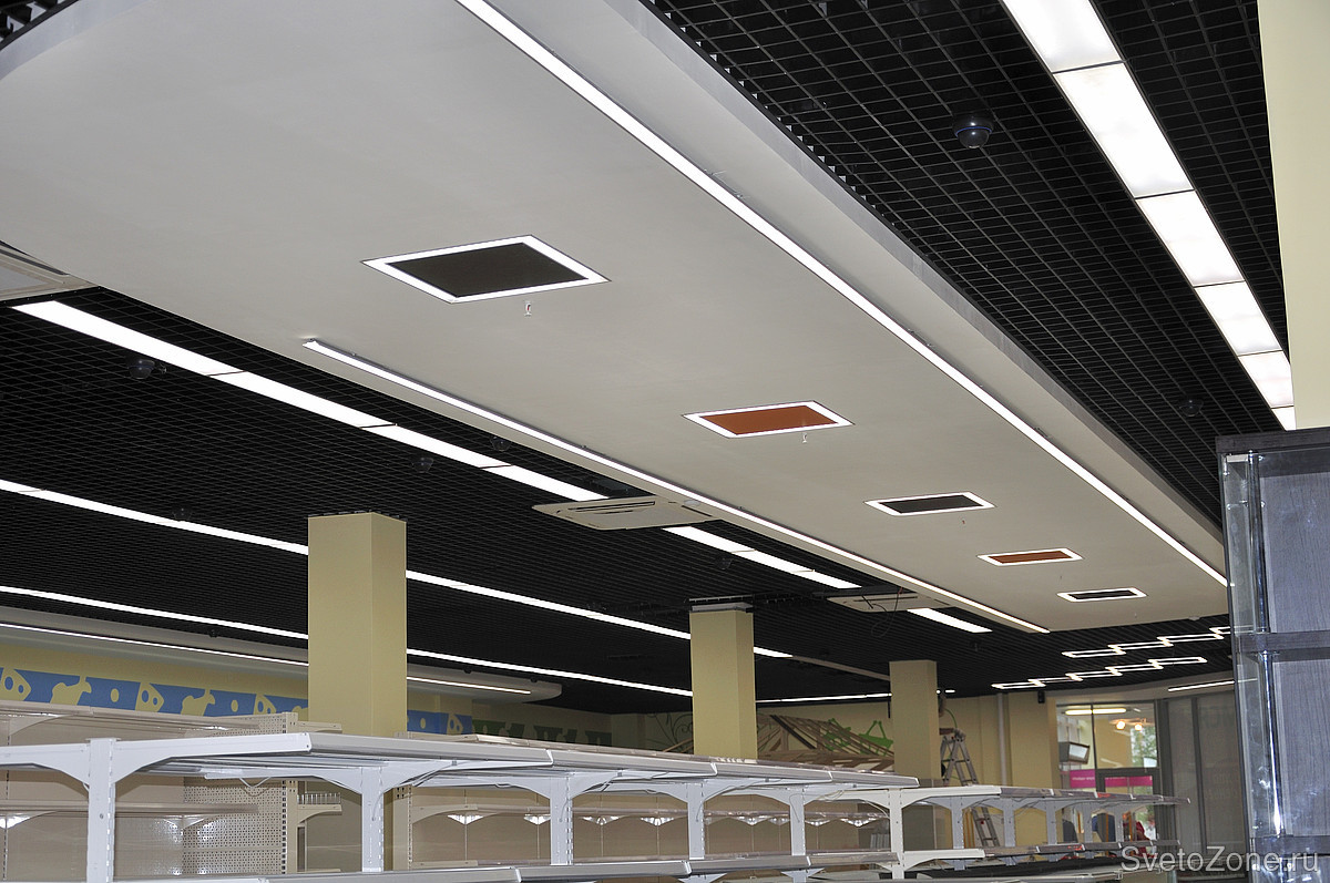 В проекте реализовано линейное освещение в потолках различных типов - грильято и гипсокартон (ГВЛ).