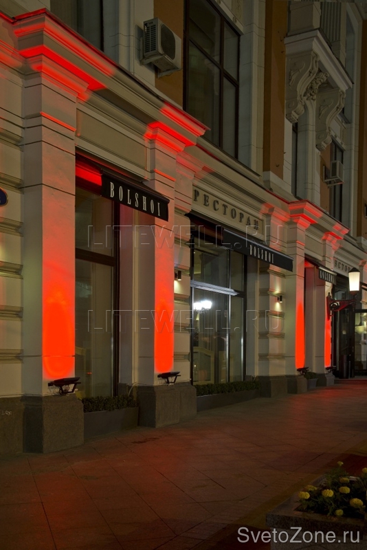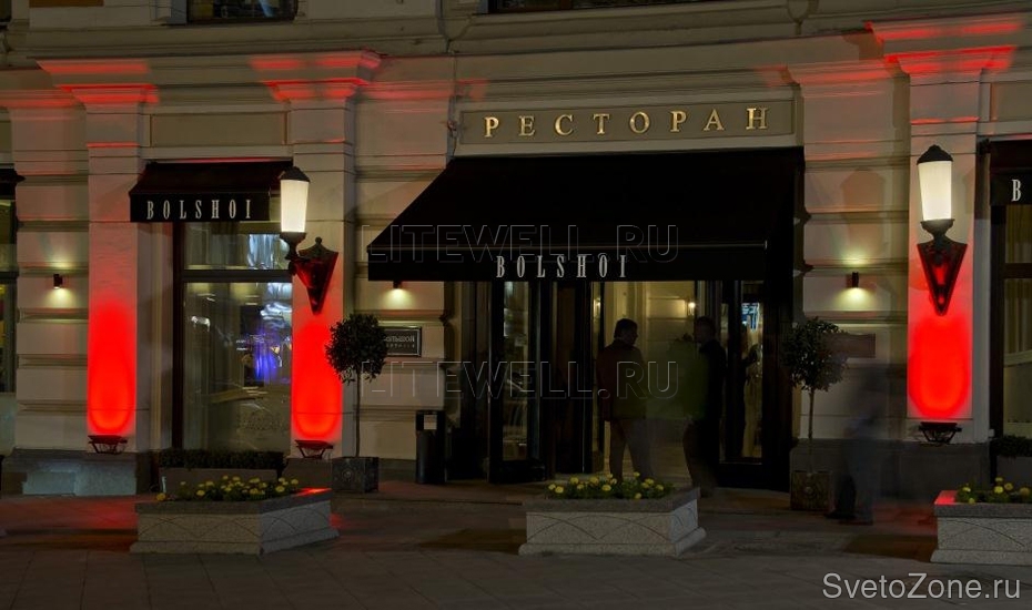 В настоящем проекте, светодиодные многоцветные прожекторы Litewell LED-G007 установлены для акцентирующей направленной подсветки центрального фасада популярного московского ресторана.