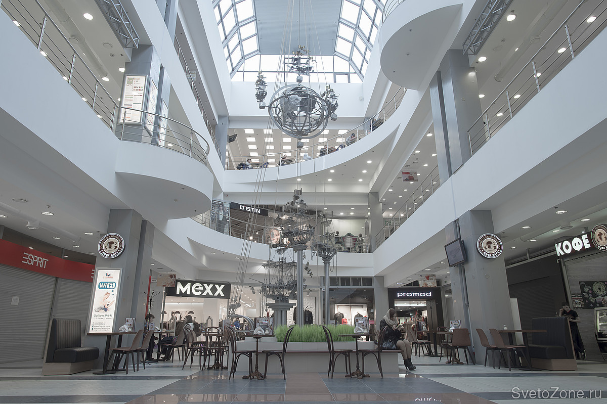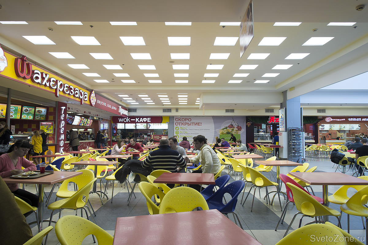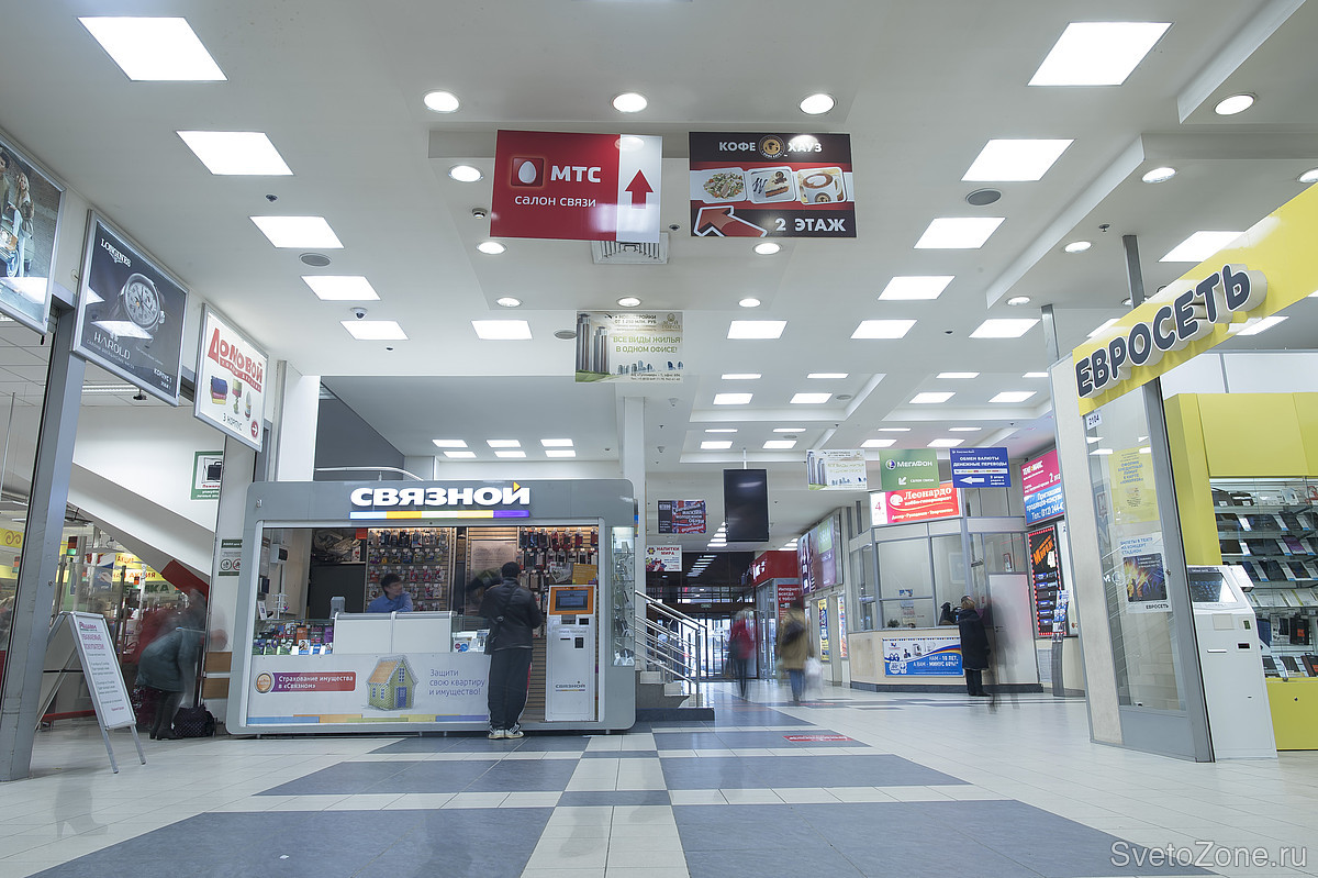 Для владельцев торгового центра очень важно было равномерно осветить коридоры, в то же время сделать акцент на витринах магазинов. Для решения этой задачи использовались светильники VARTON 595*595*50мм 36 ВТ 4000К в количестве 1300шт., VARTON 595*595*50мм 27 ВТ 4000К в количестве 500шт. и антивандальные светильники VARTON 220*90*50 мм 8 4500К в количестве 70шт. с уровнем защиты IP65.