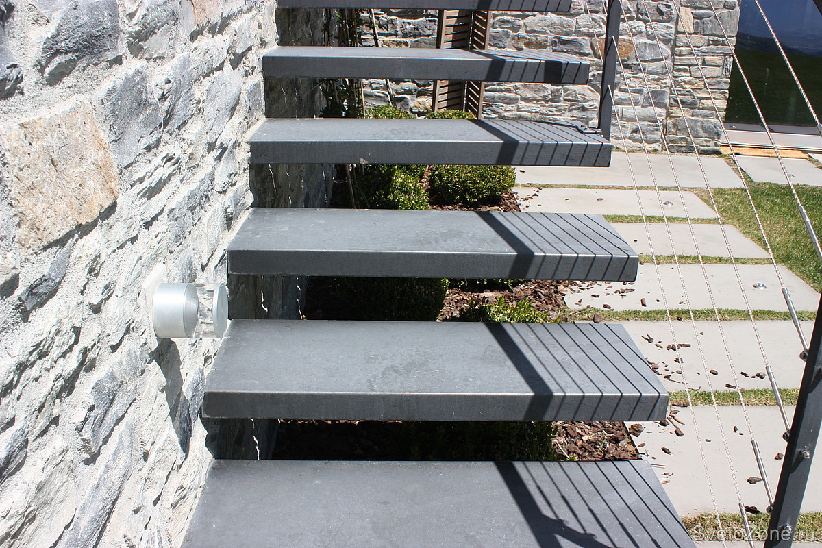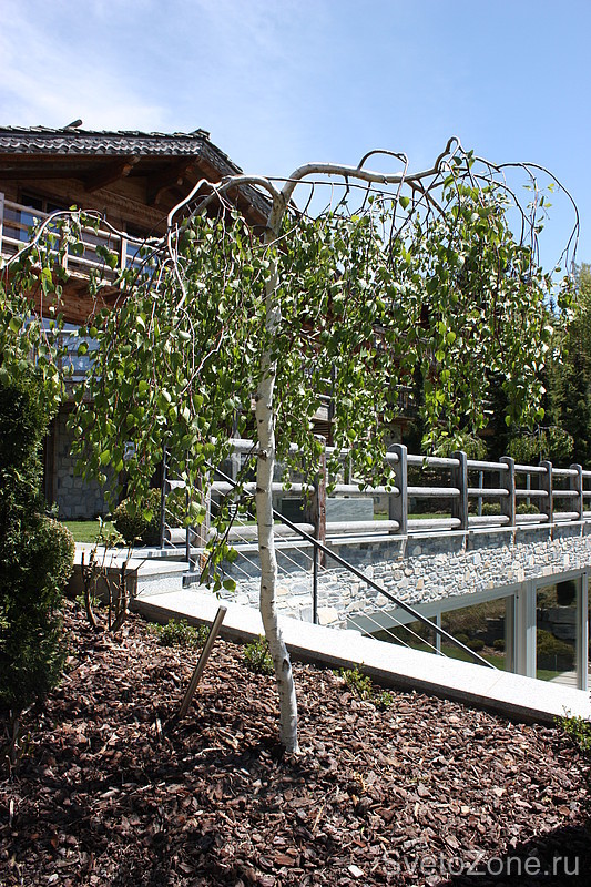 Лестницы и фундамент дома подсвечены встраиваемыми светильниками Etna Wall (линза 180°/360°) и Aura (из латуни с палладиевой отделкой и метакриловым прозрачным покрытием), а для акцентирования крон деревьев и формы кустов - Reed и Pan, привносящие в участок элементы загадочности и таинственности. |