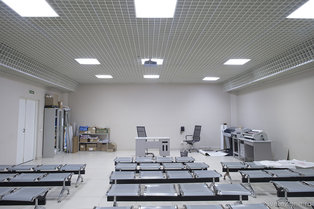 • Офисный встраиваемый светильник 595*595*50 мм, 36 Вт, 4000 К и 595*595*50 мм, 27 Вт, 4000 К для залов и коридоров.