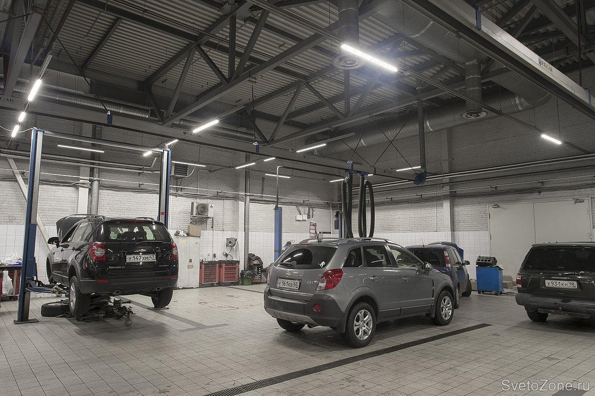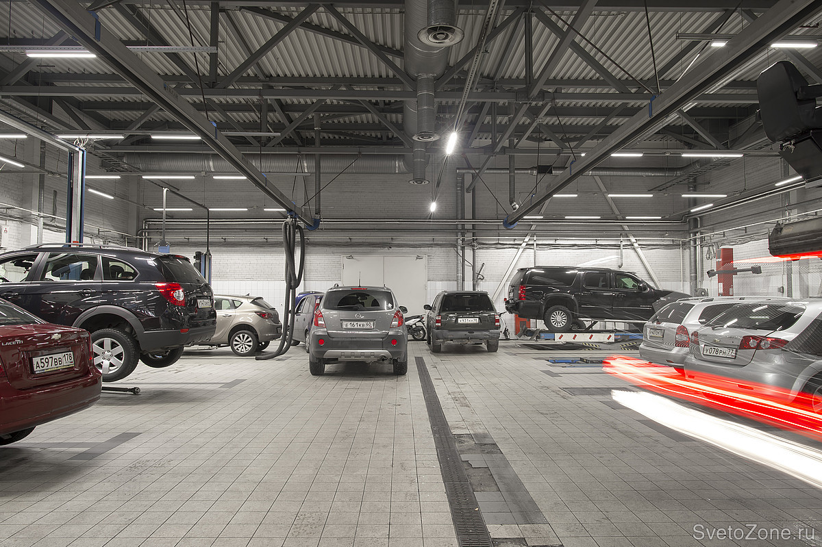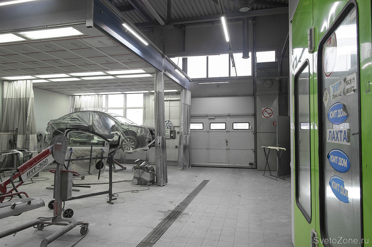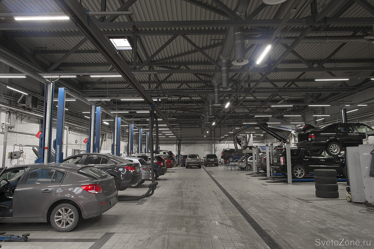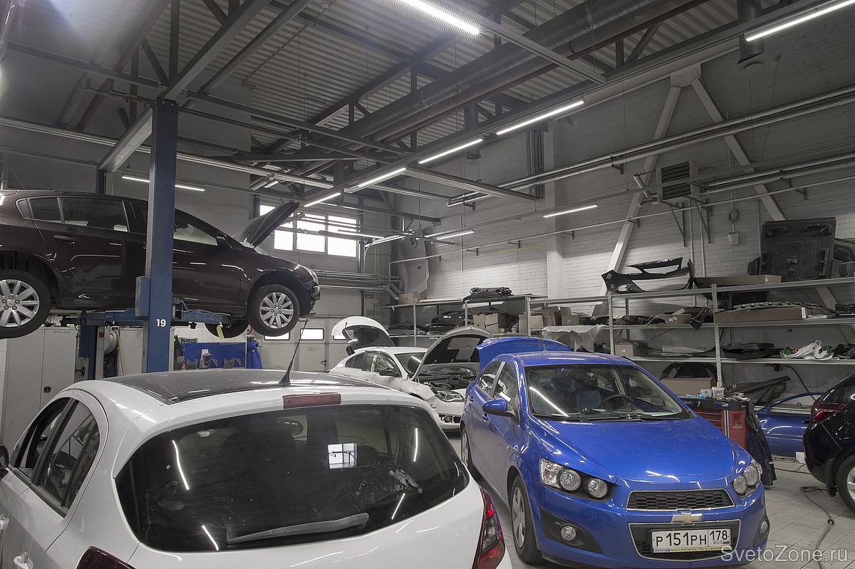 Такие помещения, как автомобильные мастерские, требуют от освещения выполнения нескольких задач одновременно: равномерного света, при котором различаются даже самые мелкие детали, безопасности при работе в запыленных помещениях. Поэтому при разработке освещения для центра технического обслуживания «Антлант-М» в городе Санкт- Петербург, учитывались не только требования к освещенности, но и расположение светильников, их безопасность, устойчивость к внешнему воздействию и т.д.
