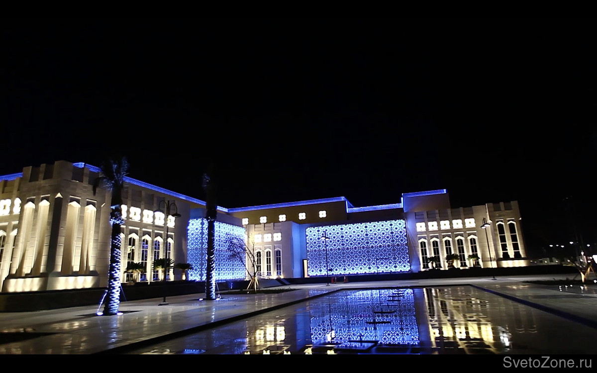 В соответствии с техническим заданием и согласно утвержденному плану, наружное освещение дворца бракосочетаний построено на основе двух составляющих – фиксированном теплом белом свете на основных фасадах комплекса, и гармонично дополняющих преобладающий белый областях с цветодинамической подсветкой. В данном проекте компания GRIVEN выступила в качестве подрядчика по освещению специфичных участков здания и прилегающей территории, на которых согласно концепции предусмотрена равномерная смена предварительно отобранной палитры пастельных тонов.
