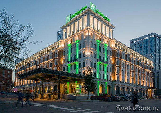 Используемое оборудование: Для создания системы освещения были использованы светильники серии IntiLINE нейтрального и теплого белого света с углом раскрытия луча 30° и 60°. 30-сантиметровое исполнение IntiLINE позволило использовать их в качестве компактных прожекторов, размещенных в межоконных пространствах. На верхнем ярусе здания светильники выполняют сразу две задачи: с одной стороны, они освещают фасад, а с другой – карниз здания. Это стало возможно благодаря правильному подбору оптики и точной юстировке при монтаже оборудования.