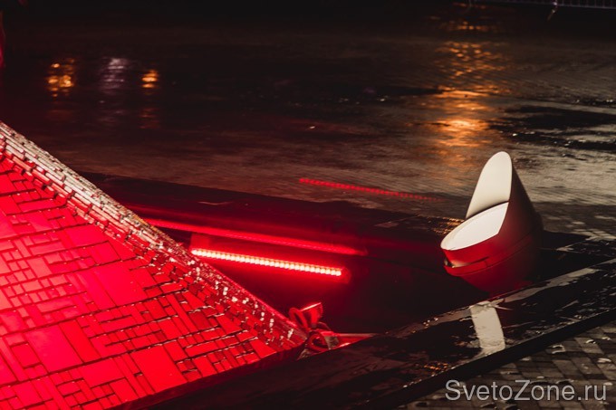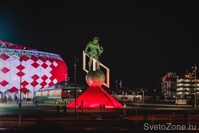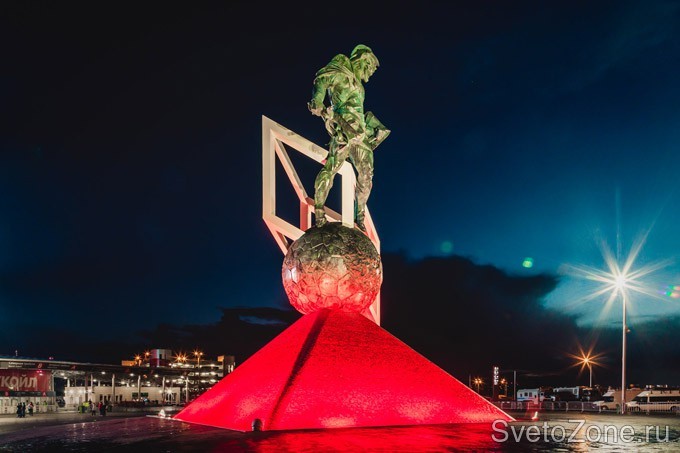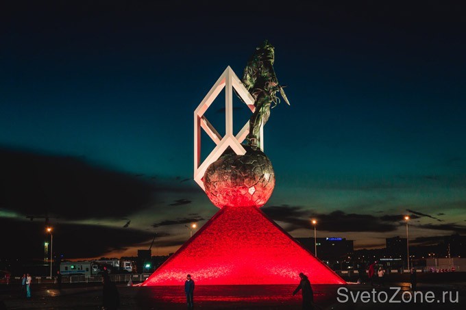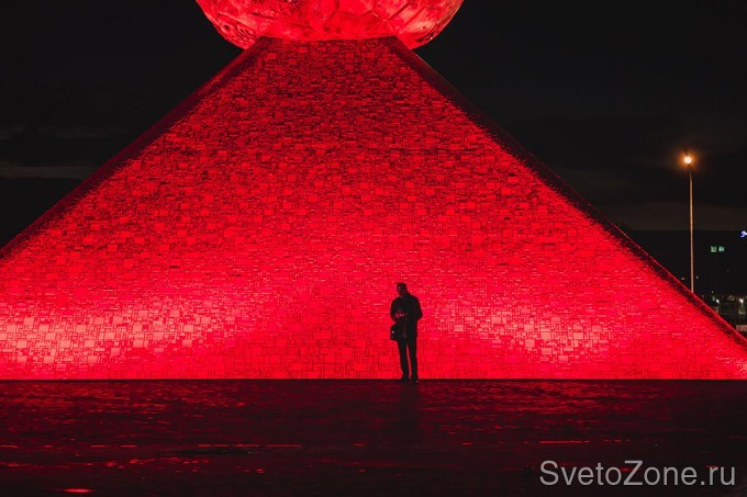 Используемое оборудование: для проекта были изготовлены 64 светильника IntiLINE красного цветового спектра с овальной оптикой 10х50°. Они равномерно «заливают» все грани пирамиды. Ребра конструкции дополнительно выделены точечными 12-тиградусными прожекторами IntiTOP также красного цвета. Драматический прием освещения снизу вверх, использованный в проекте, буквально «зажигает» основание и делает фигуру героя еще более фактурной.