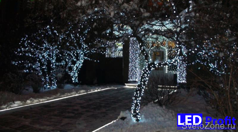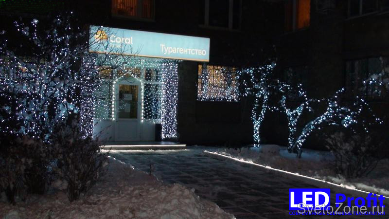 Светотехническое декорирование прилегающей территории туристического агенства Coral Travel (Москва). В рамках производства работ были украшены светодиодными гирляндами деревья, декорирован светодиодной лентой бордюрный камень, оформлена входная группа и окна. |