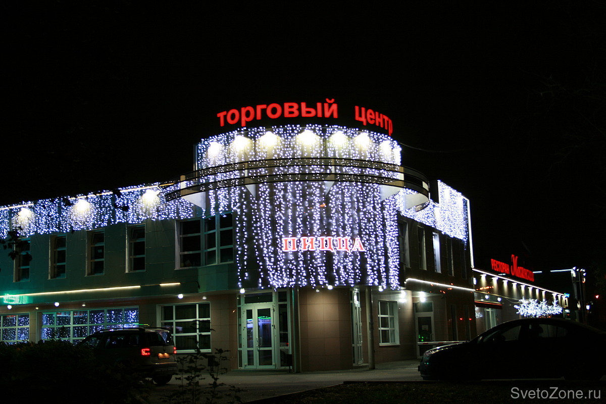 Световое декорирование светодиодной бахромой и нитями фасада торгового центра