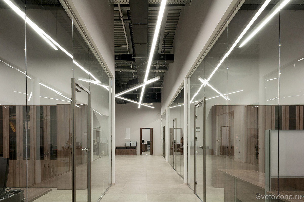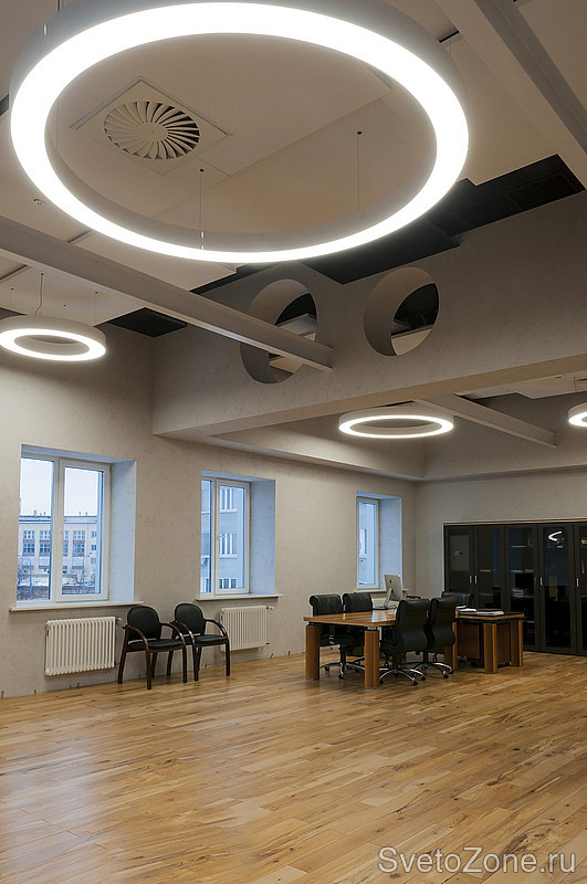 Также в проекте установлены светильники в форме колец на светодиодных источниках света разных диаметров и сложные линейные конструкции по индивидуальному дизайну в коридорах. |