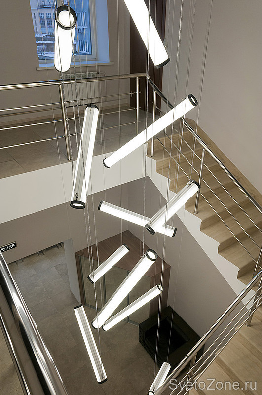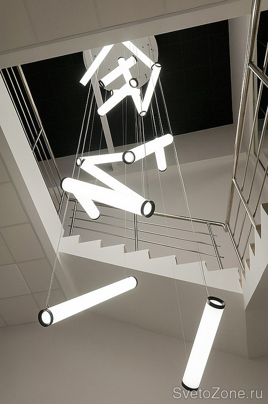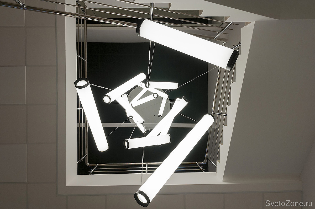 Центральной композицией в офисе стала подвесная конструкция из светящихся "тубусов" трех размеров, расположенная в лестничном пролете. Созданная из 15-ти светильников, с основанием диаметром 1,5м, длина световой конструкции составляет 6м.