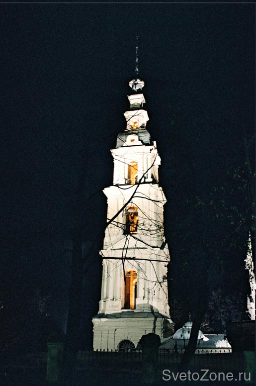 Основной поток света направлен на верхнюю часть собора, так как близко прилегающая зеленая зона не дает полной возможности высветить колокольню в полную ее высоту. Через зеленую зону, верхняя часть, видна из многих точек. Как известно, в христианской архитектуре чем выше расположен элемент, тем больше его символическое значение - собор и колокольня расположены на возвышенной территории, что делает еще более выигрышным эффект подсветки.