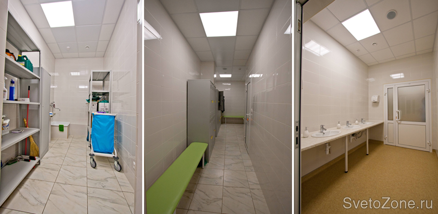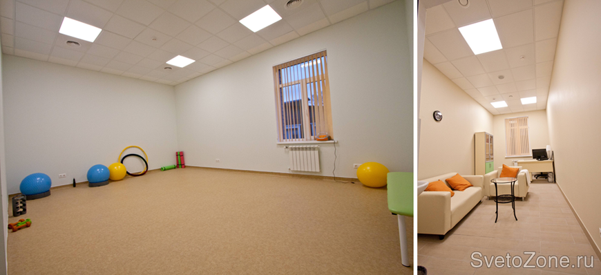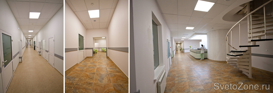 Основными светильниками для освещения помещений медицинского центра стали встраиваемые светодиодные светильники серии «ОФИС IP54» с возможностью установки в потолки типа Clip in.