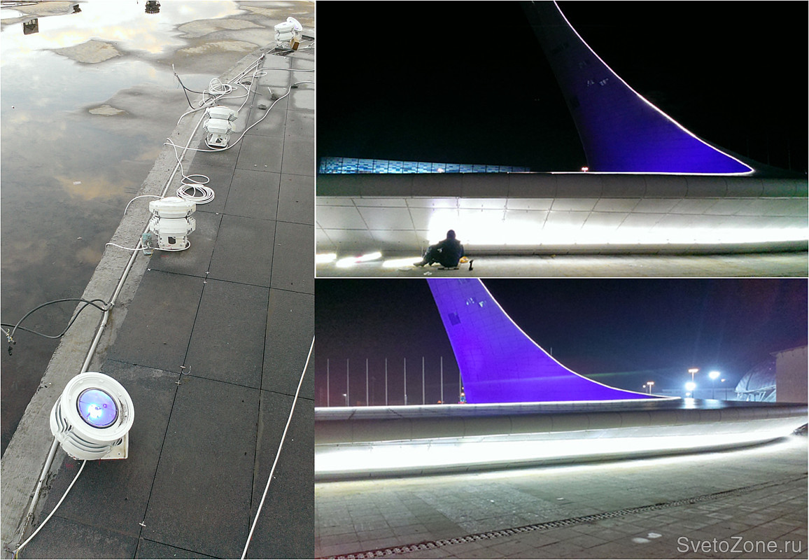 После утверждения концепции освещения чаши Олимпийского огня с заказчиком в работу влилась группа специалистов-монтажников. В кратчайшие сроки монтажной бригадой было смонтировано более 500 светильников марки «ZERS».