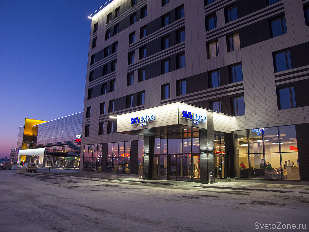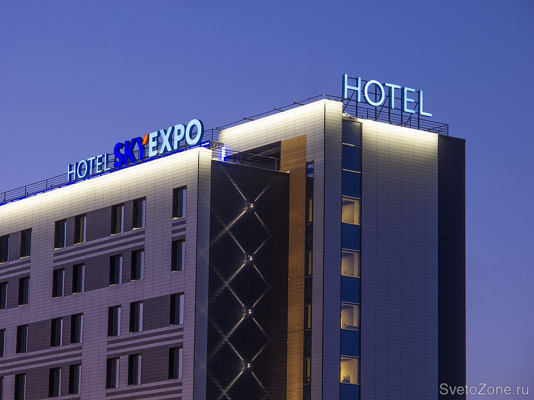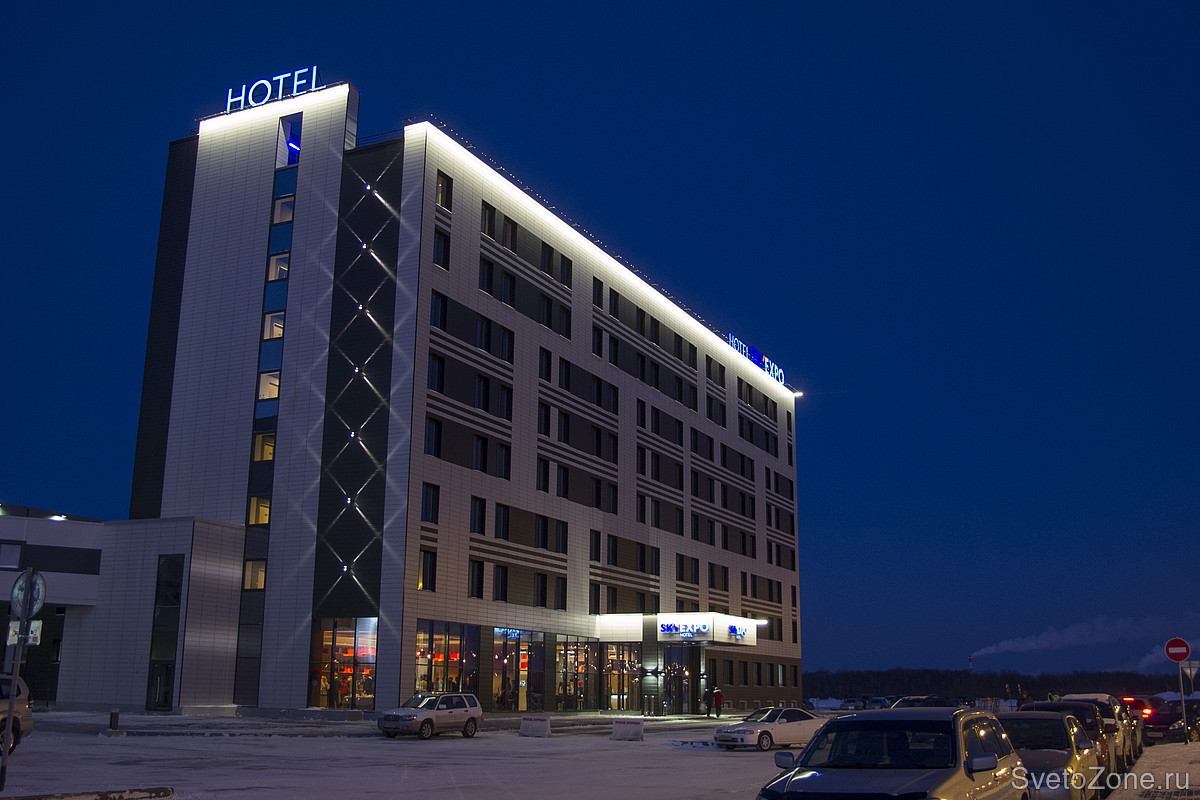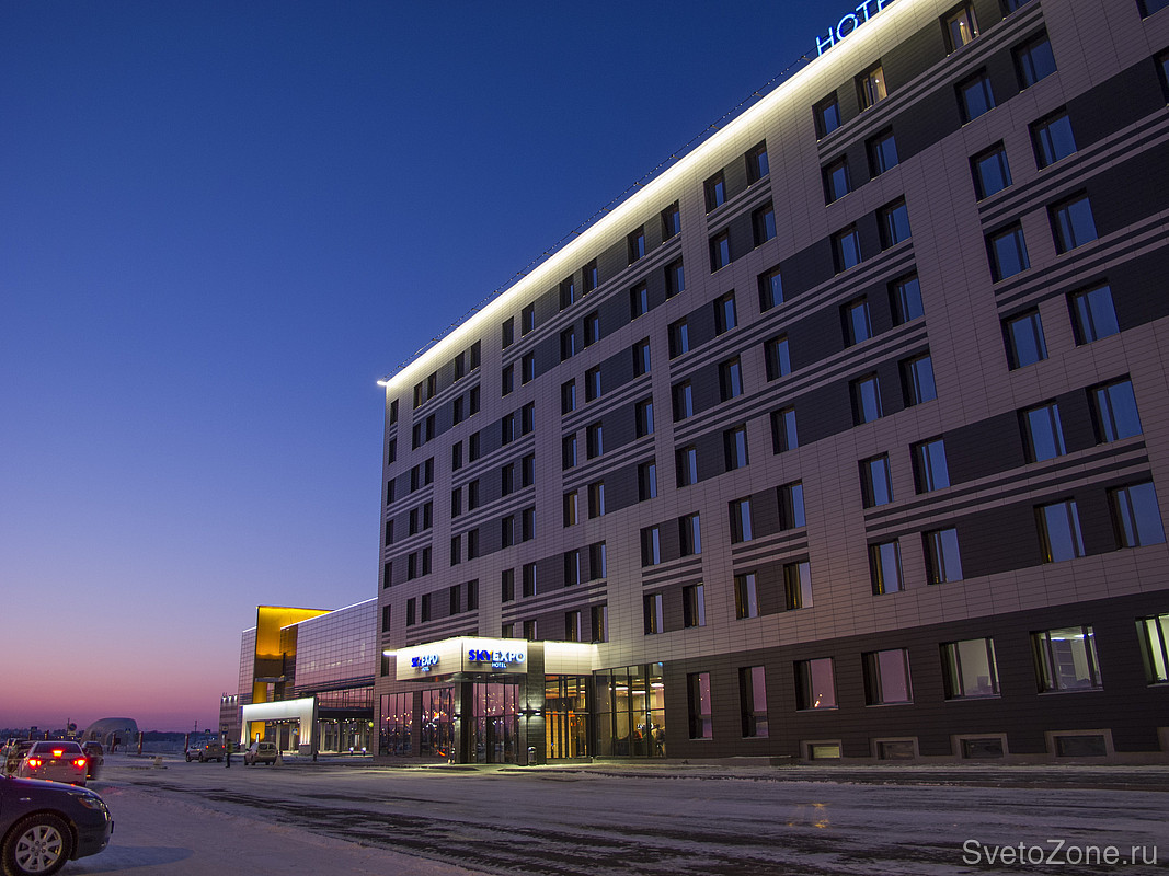 В рамках данного проекта применялось осветительное оборудование итальянского и российского производства. Лаконичный стиль архитектуры подчеркивает освещение парапетов здания и декоративная освещение узколучевыми МЛГ светильниками.