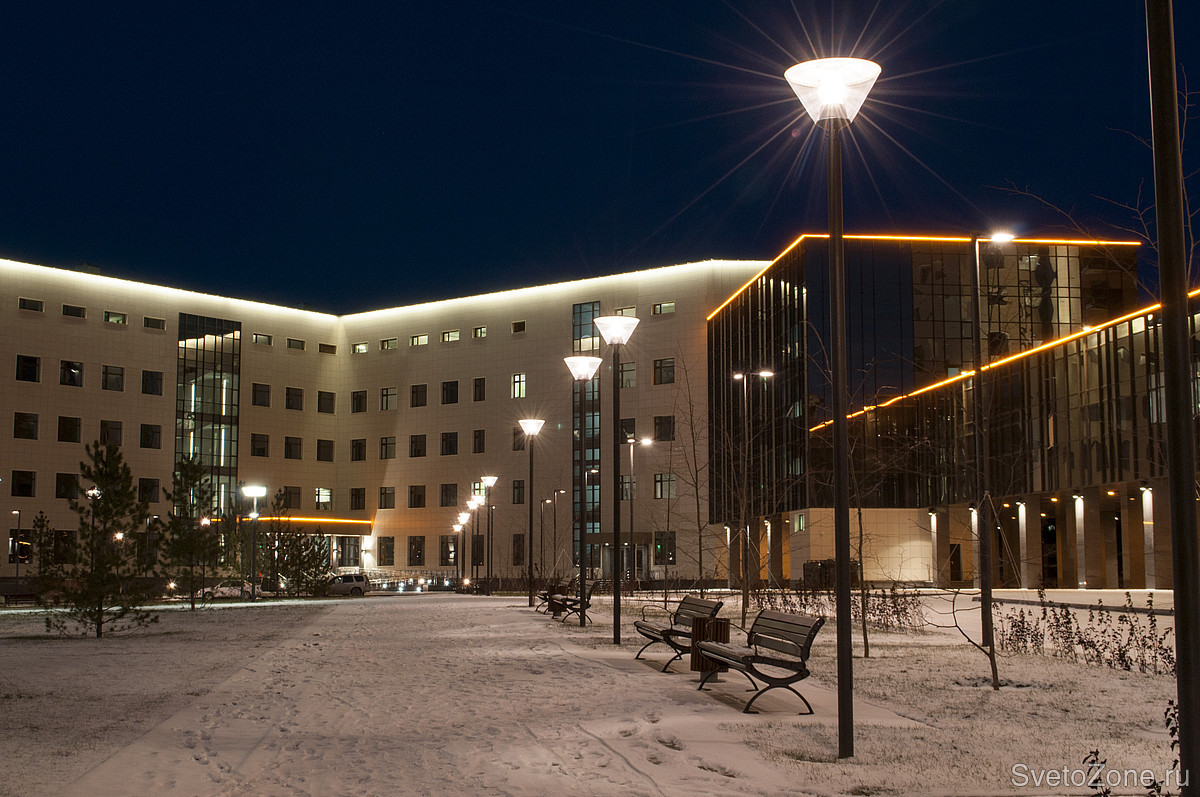 Также выполнен проект по освещению зоны благоустройства перед корпусом ректората и дворовой зоны учебного корпуса, где были учтены опоры 6-8 метров и две декоративные мачты по 11 метров.