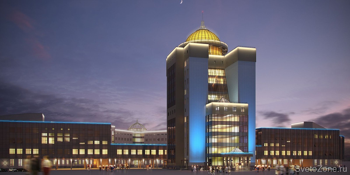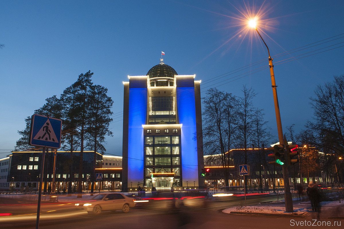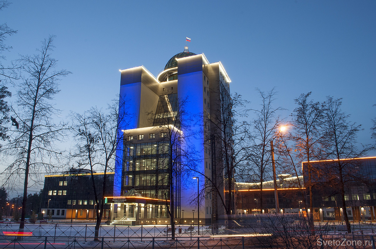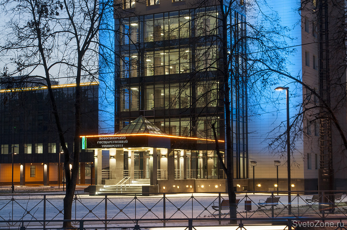 Для подсветки высотного фасада административного здания Новосибирского государственного университета (НГУ) выбрана концепция заливающего освещения с использованием цветодинамических прожекторов.