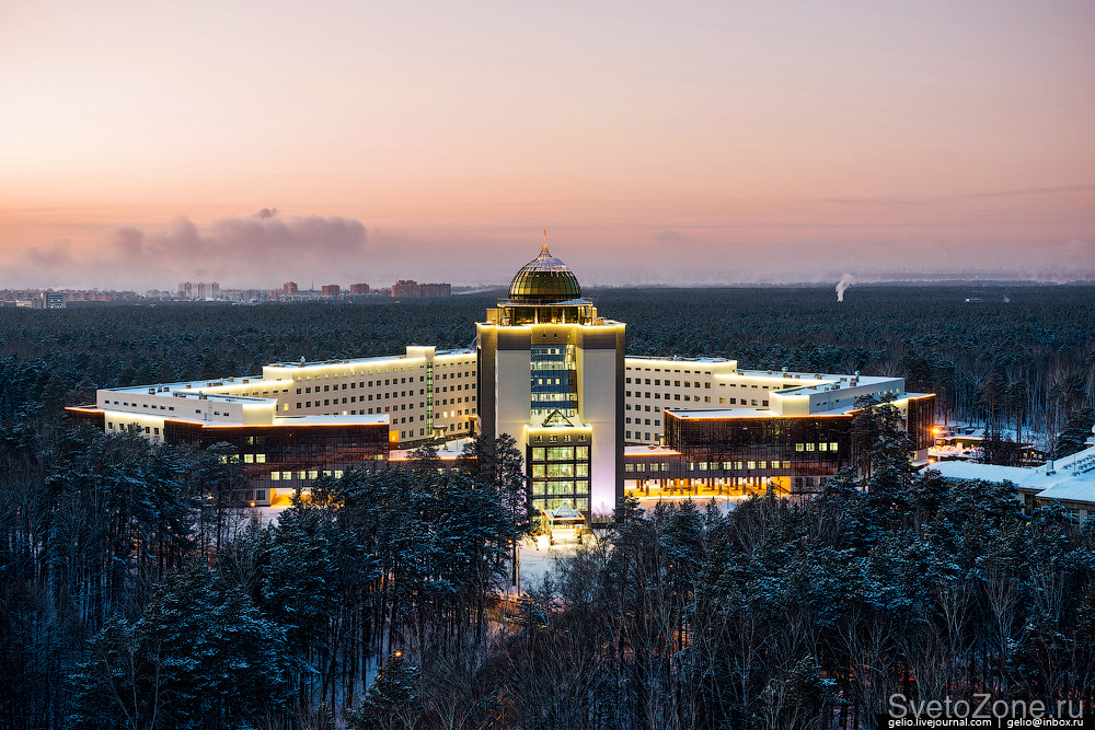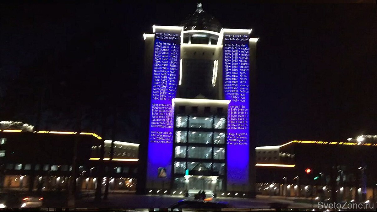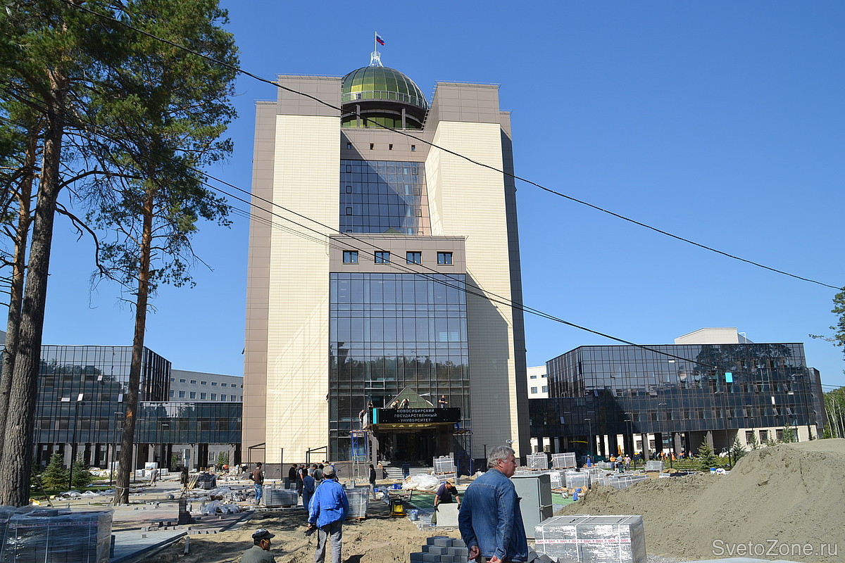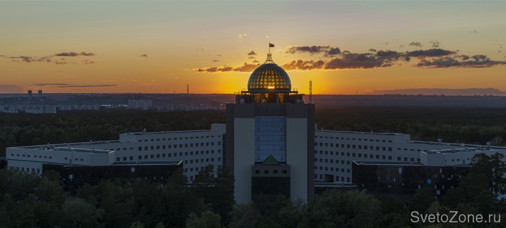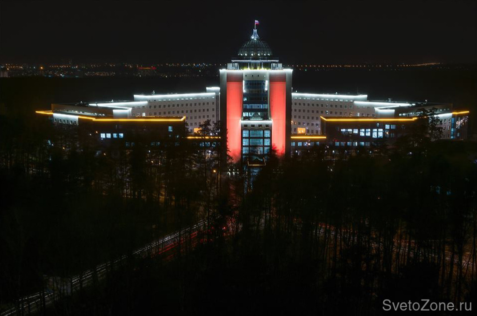 Для подсветки высотного фасада административного здания Новосибирского государственного университета (НГУ) выбрана концепция заливающего освещения с использованием цветодинамических прожекторов.