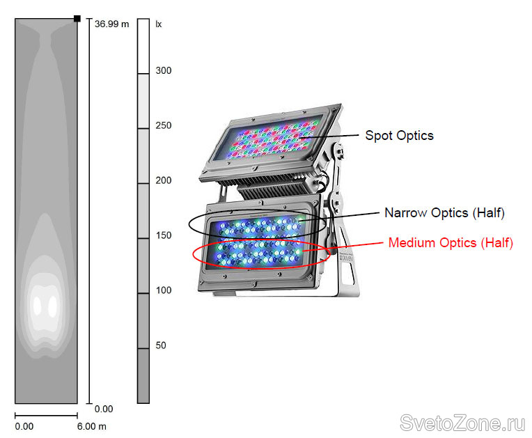 Стоит отметить, что один из вариантов предлагает опциональное решение, предусматривающее комбинирование в нижнем модуле оптических групп NARROW и MEDIUM. При этом верхняя секция, работающая по поверхности фасада на более высоких отметках, оснащена узкоугольной оптикой SPOT. В соответствии с результатами расчетов, подобное сочетание компоновки вторичной оптики принято в качестве наиболее оптимального.