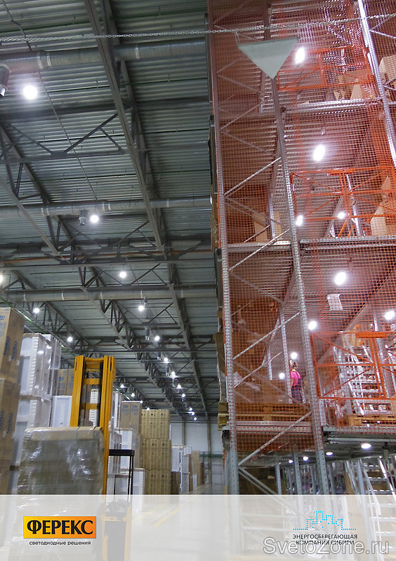 Основное освещение с газоразрядными лампами ДРЛ 400Вт заменили LED-светильниками ДСП мощностью 130Вт. Это позволило в 3,5 раза сократить энергопотребление. Для обеспечения необходимого уровня освещенности новых светильников потребовалось на 100 меньше, чем традиционных. Средняя освещенность в комплексе составила 200 лк, между стеллажами – 150 лк.