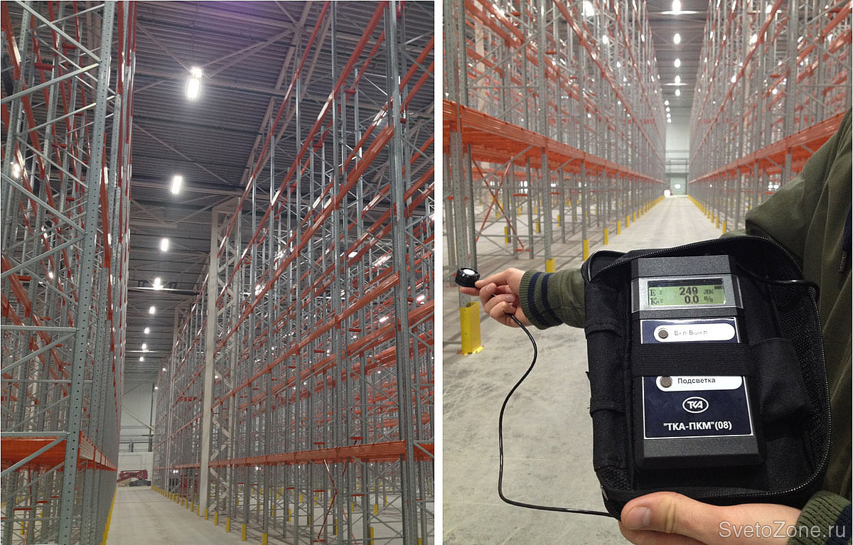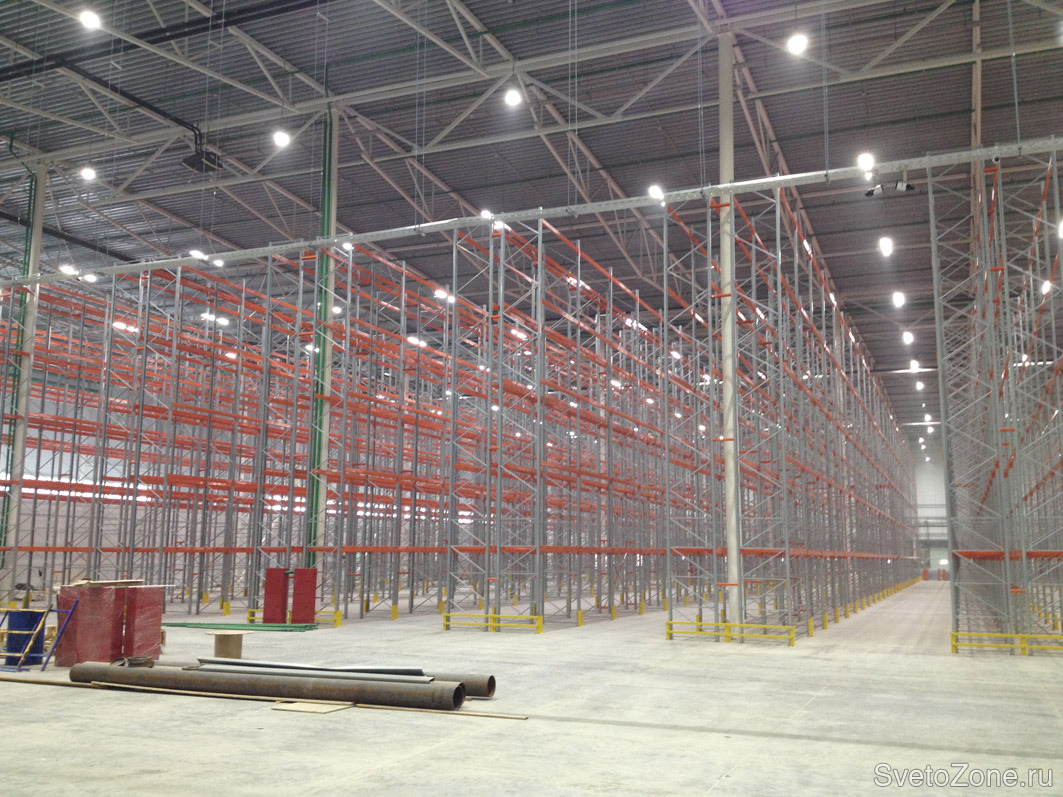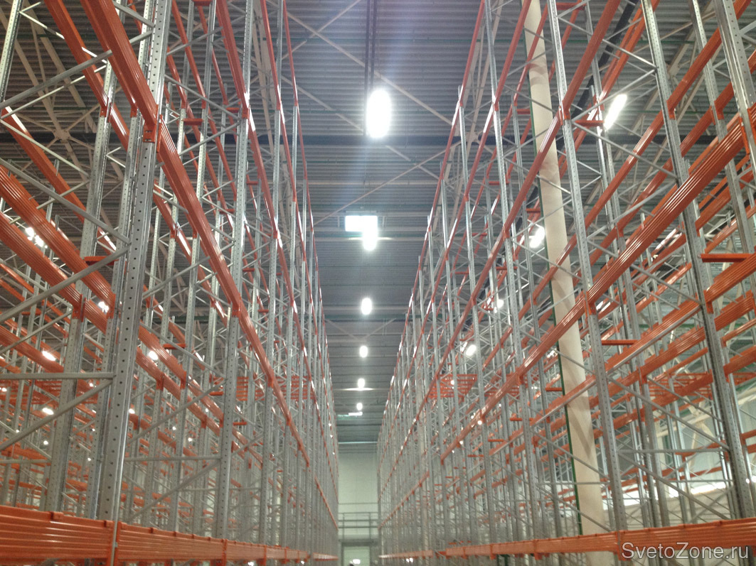 При строительстве нового складского комплекса было принято решение о выборе в качестве источников света современных энергоэффективных светодиодных светильников. Была поставлена задача по освещению складских территорий с достижением среднего уровня освещенности на высоте 0,8 м от пола: в высокостеллажной зоне – 200 лк, в зоне погрузки-выгрузки – 300 лк. Высота подвеса светильников – 12,5 м.