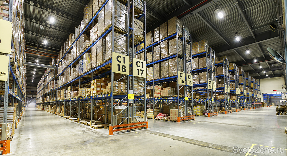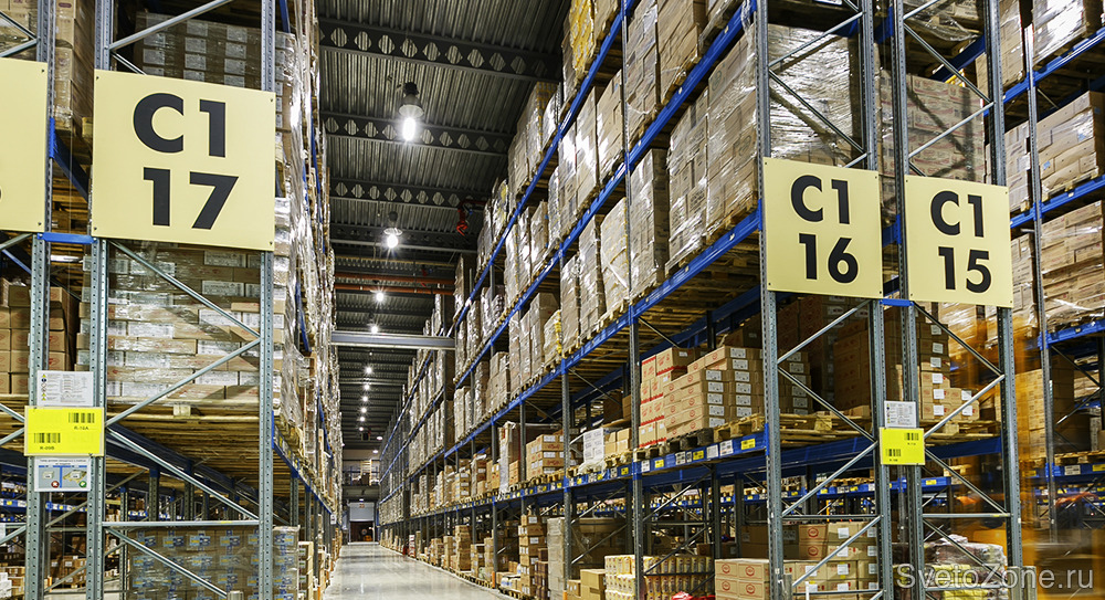 Освещение крупного логистического центра. Для освещение стеллажей рекомендуется использовать точечную подсветку, поэтому на данном объекте были установлены светильники Енисей 48.10500.90. с модификациями КСС К (30°) и Г (60º). |