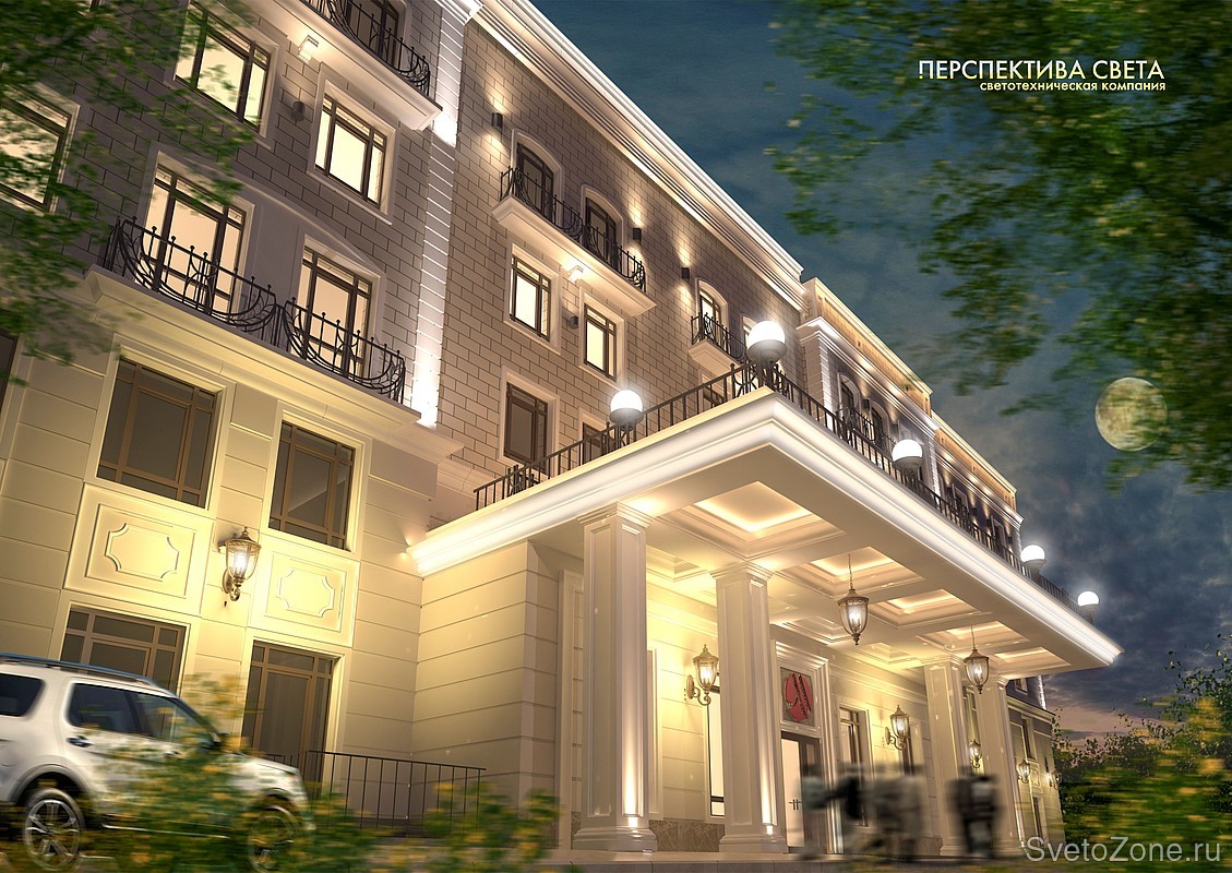 В концепции освещения предполагалась подчеркнуть стиль неоклассицизма. Заливающий свет кровли, точечное освещение балконов, акцентированный свет на колоннах были основной идеей архитектурной подсветки здания. |