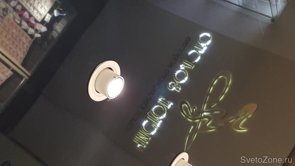 Было решено установить поворотно-выдвижной даунлайт Aberlicht DLR 18/15. Этот маленький светильник выдает световой поток в 1400 Лм, что идеально подходит для представления красоты золота и камней. Кроме того, его механизм делает светильник совершенно мобильным, позволяя менять угол свечения по желанию продавца или клиента. Всего было установлено 4 даунлайта, которые, помимо прочего, отлично вписались в интерьер.