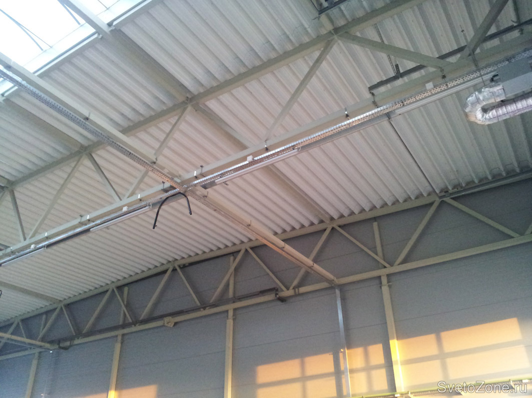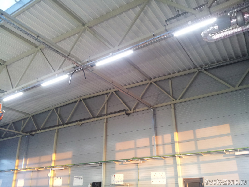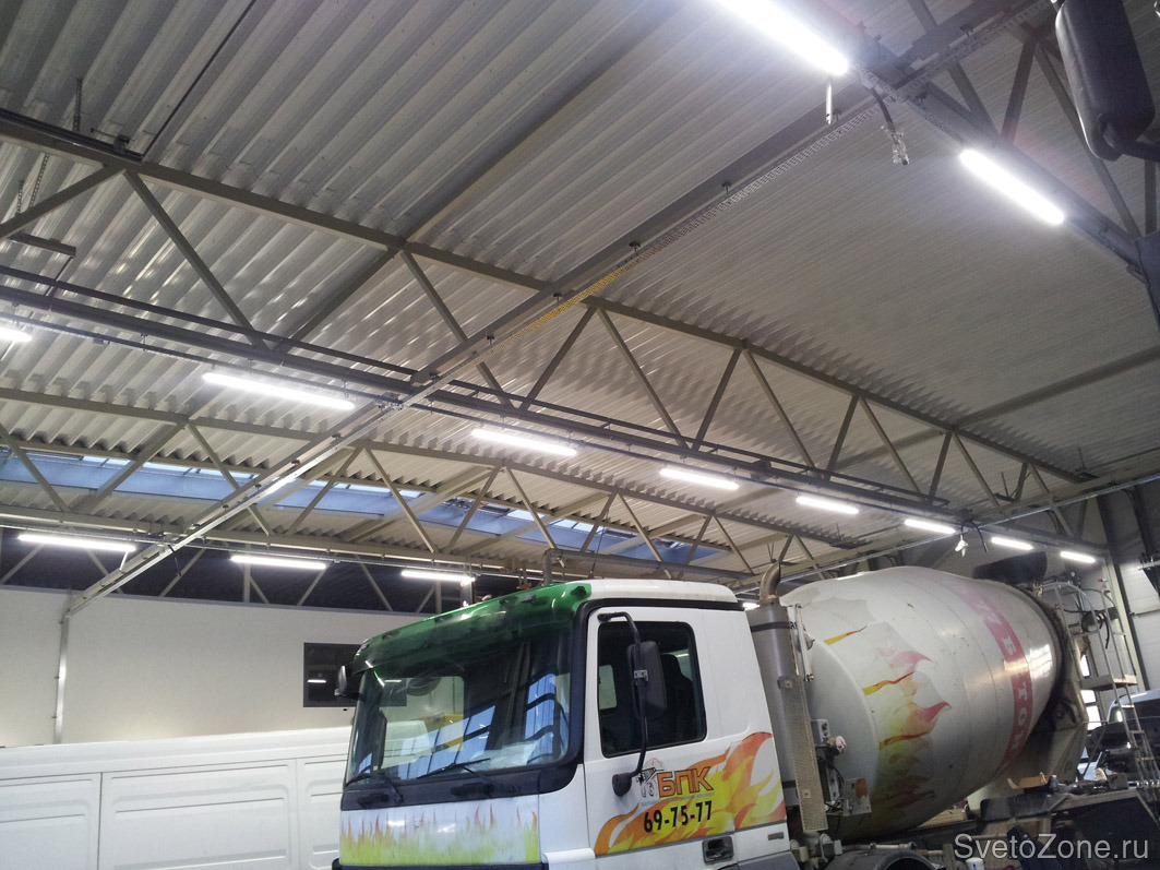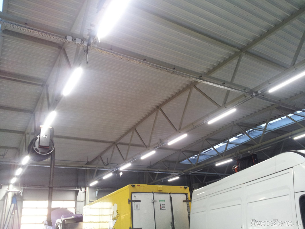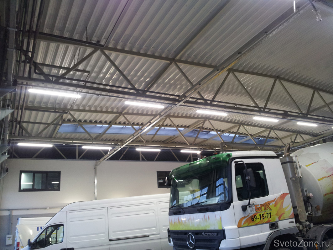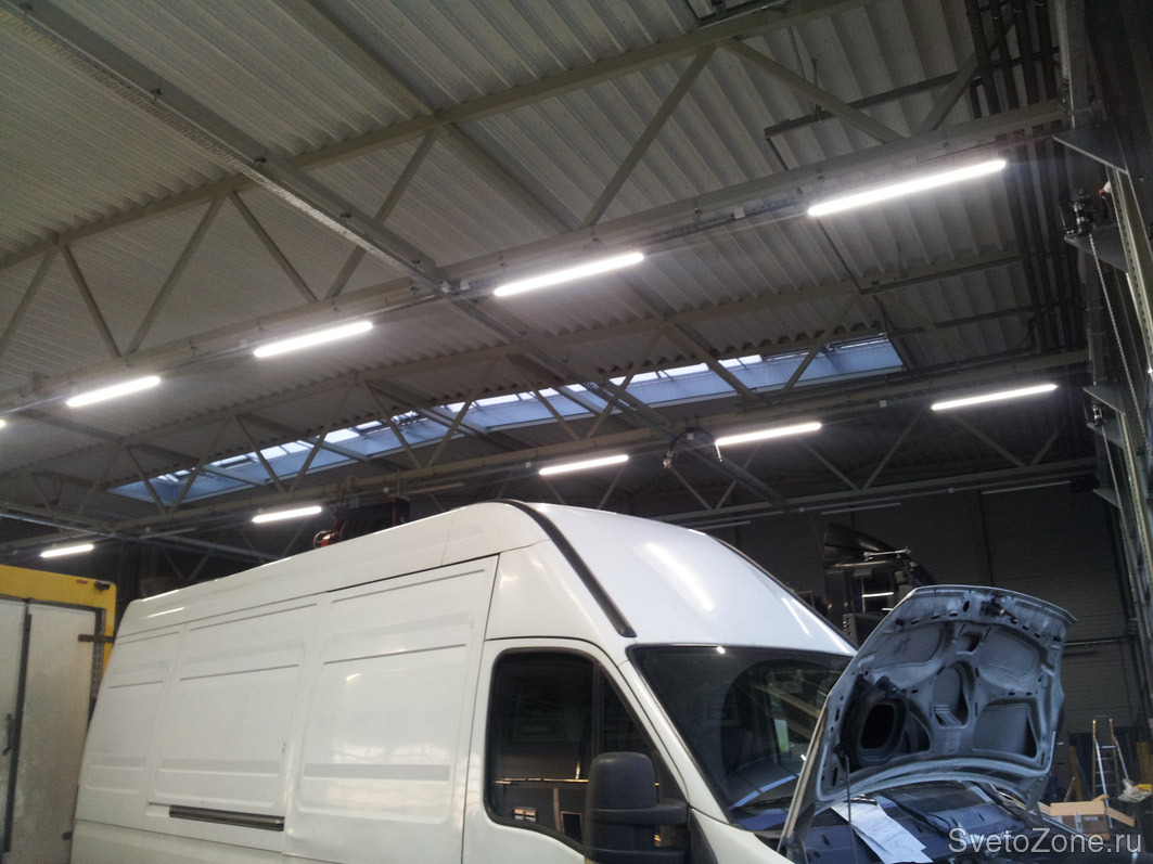 Освещение бокса автосервиса ООО ЕВРО ТЕХНИК (официальный дилер IVECO) светодиодными светильниками ДСО мощностью 65 Вт (ТМ "ФЕРЕКС", Россия). Установлено 63 светильника.
