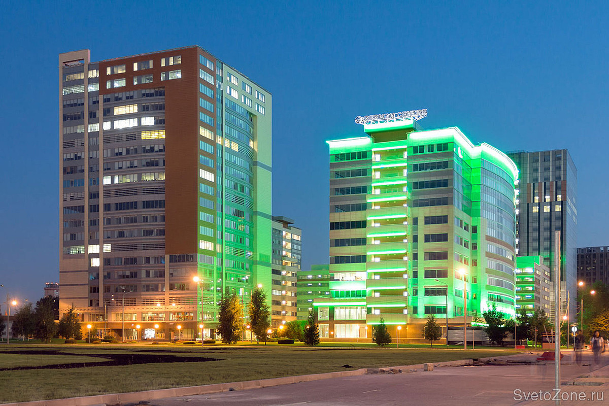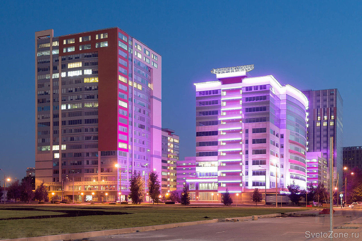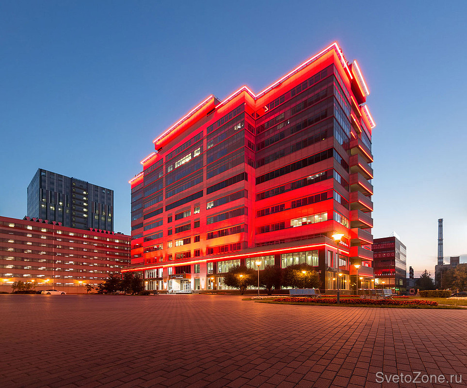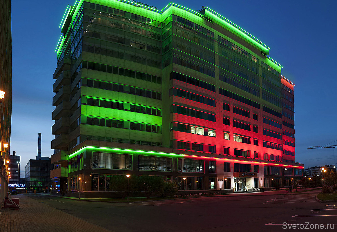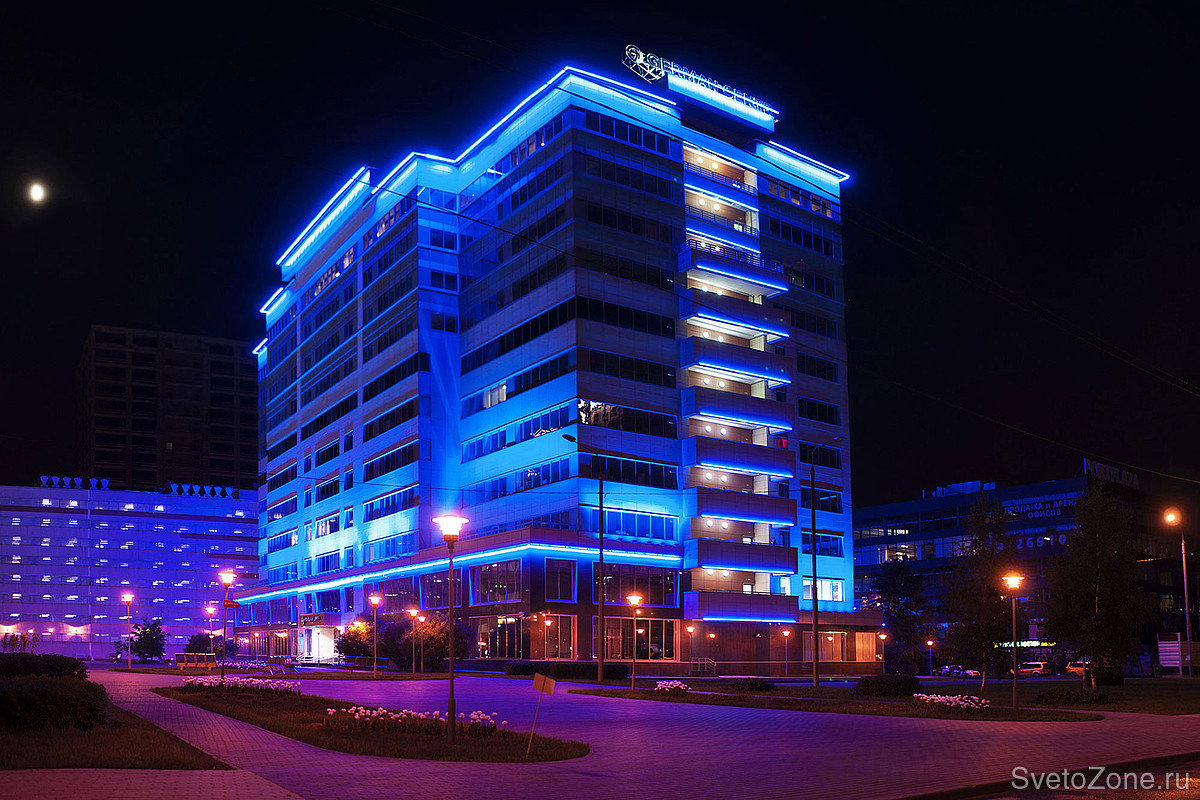 Используемое оборудование: Для заливающего освещения фасада были использованы RGB-прожекторы серии IntiSTARK с оптикой 10х50° различной мощности. Светильники установлены в основании третьего этажа на выносных кронштейнах по периметру здания.