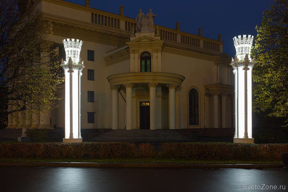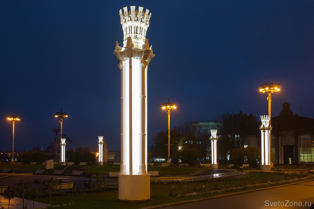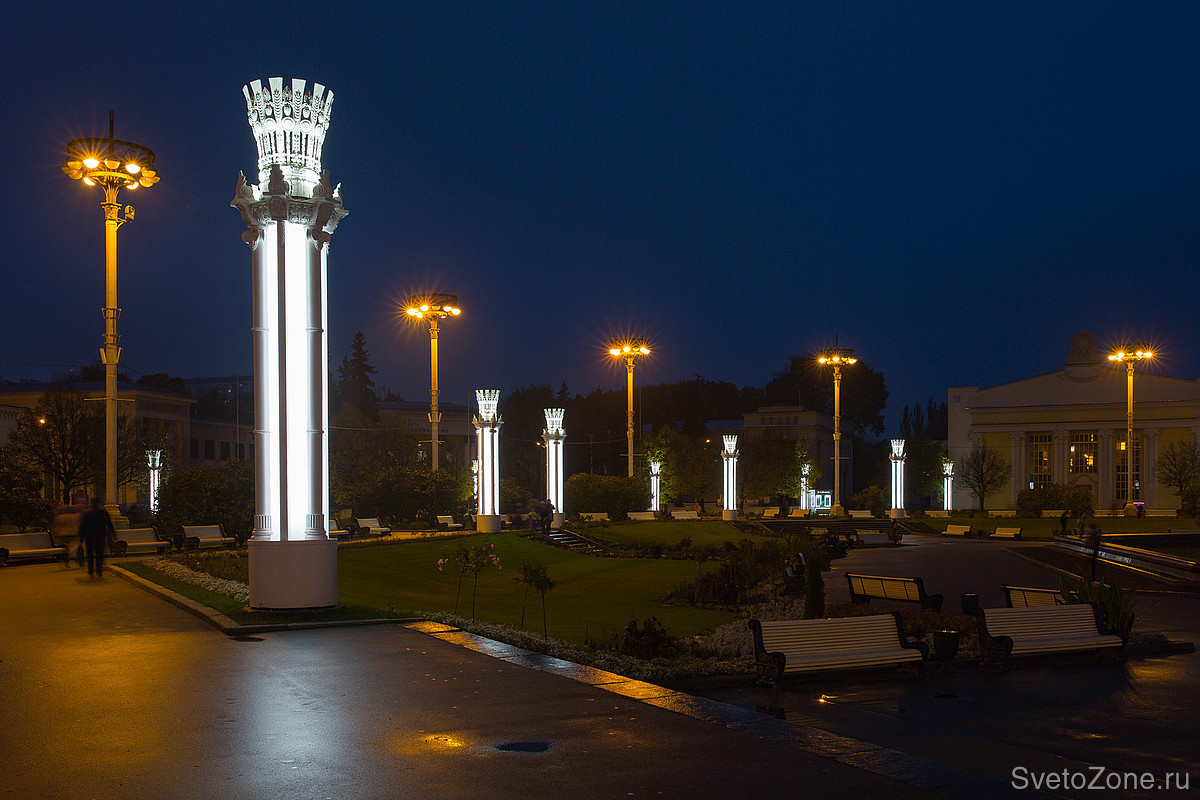 Так, уникальные светильники отраженного света 50-х годов 20 века, расположенные около центральных павильонов, до реставрации не горели и были похожи скорее на обветшалые колонны. У фонарей отсутствовали отдельные детали, поэтому, чтобы достоверно восстановить кронштейны, цоколи и светильники, архитекторам пришлось изготовить утраченные фрагменты по архивным материалам — чертежам и фотографиям. В советское время в фонарях использовались люминесцентные лампы. Им на замену были установлены современные светодиодные светильники серии IntiTUBE длинной 130 см, по 9 штук на каждую колонну, а также светильники серии IntiSPOT - для короны. Теперь, как и на старых фотографиях, можно наблюдать «свечу» фонаря, которая горит целиком нейтральным белым светом, а скрытые за кожухом светильники IntiTUBE располагаются вертикально по всей высоте столба, оставаясь при этом незаметными. Всего было реконструировано 46 фонарей.
