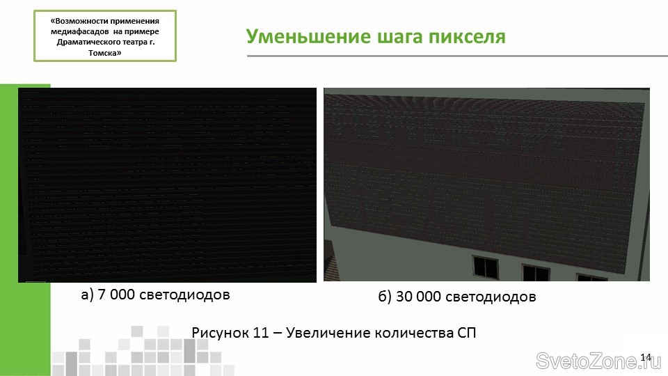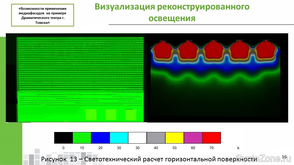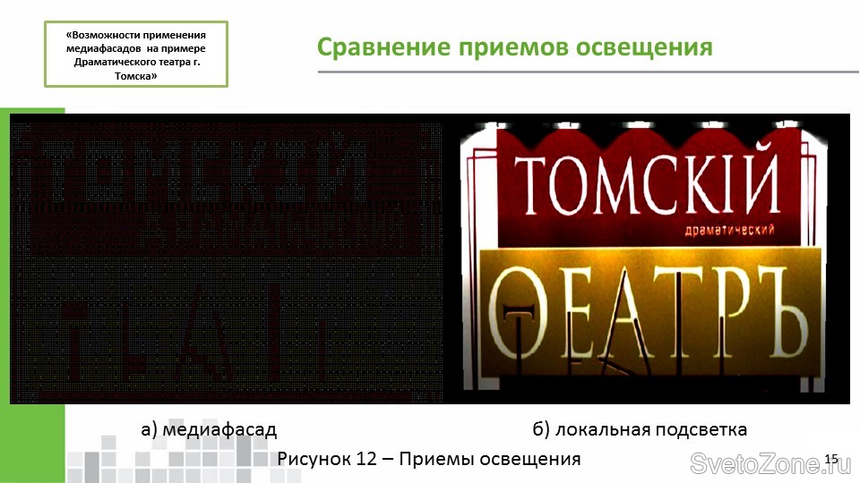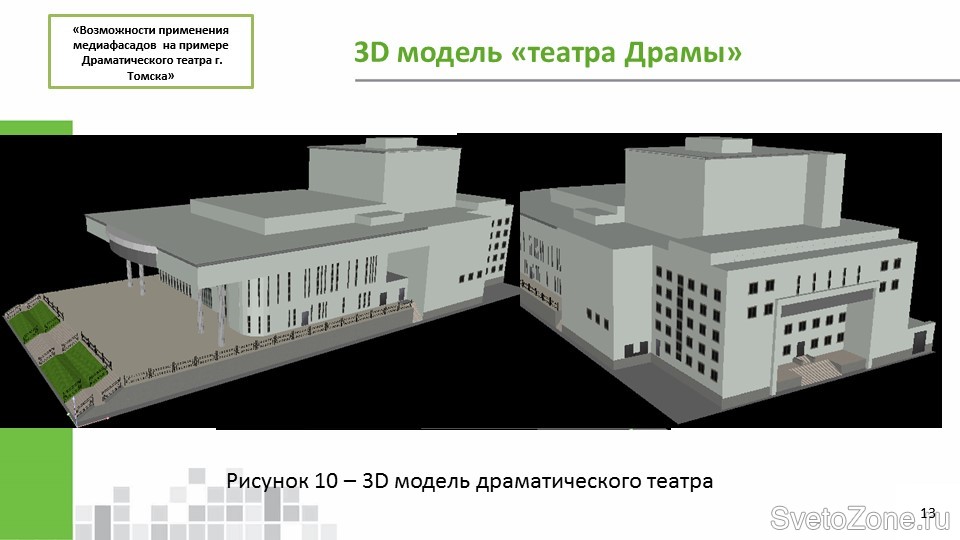 Данный проект является выпускной квалификационной работой. Здание драмтеатра построено без чертежей, по фото, так как сотрудники отказались в предоставлении таковых. На реализацию к сожалению, так и не удалось найти финансирование, ибо проект очень дорогой, несмотря на то что оп расчетам должен быстро себя окупить. Конструкция медиафасада включает в себя рейки со встроенными в них светодиодами, которым путем применения цветокорректирующих светофильтров было получено данное изображение. Также было произведено сравнение с применением МГЛ. Целью данной работы было освободить театр от всевозможных баннеров и вывесок. |