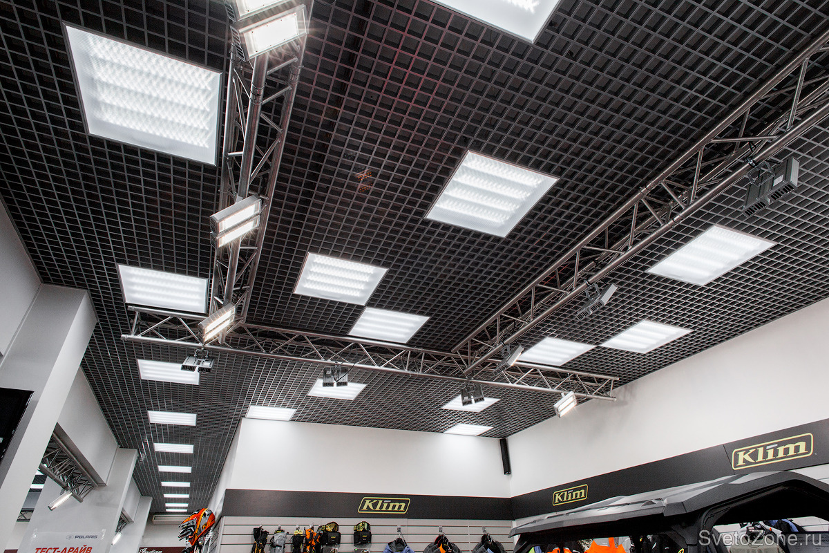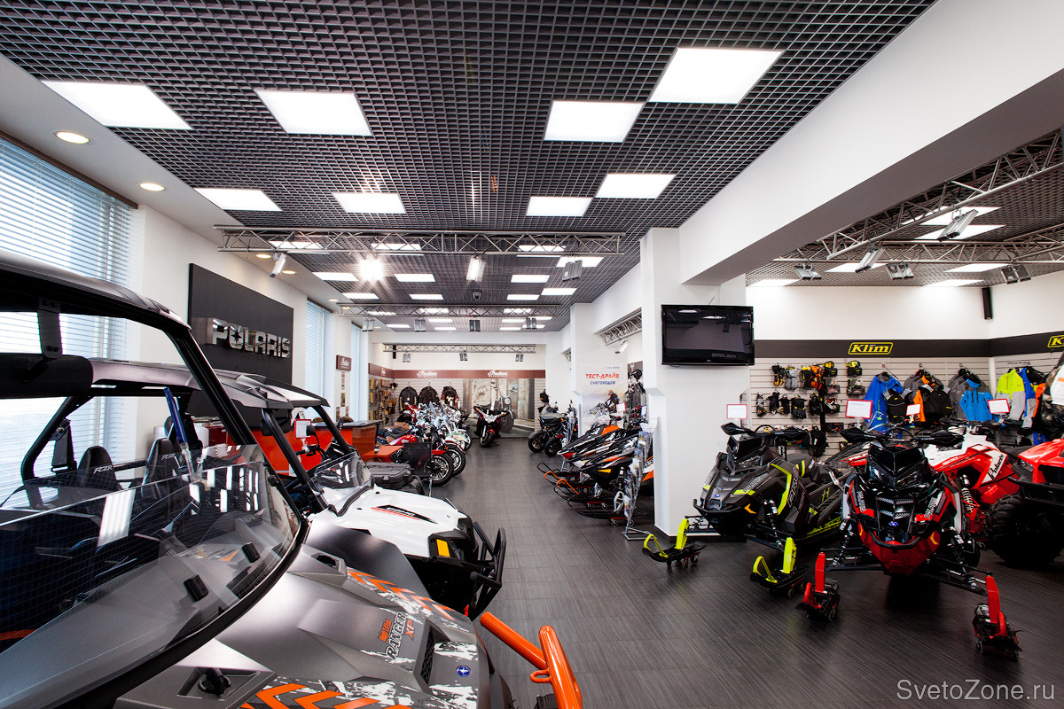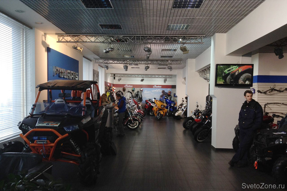 Благодаря установке новых светильников, удалось достичь равномерного освещения мотосалона, а с помощью прожекторов - расставить акценты. |