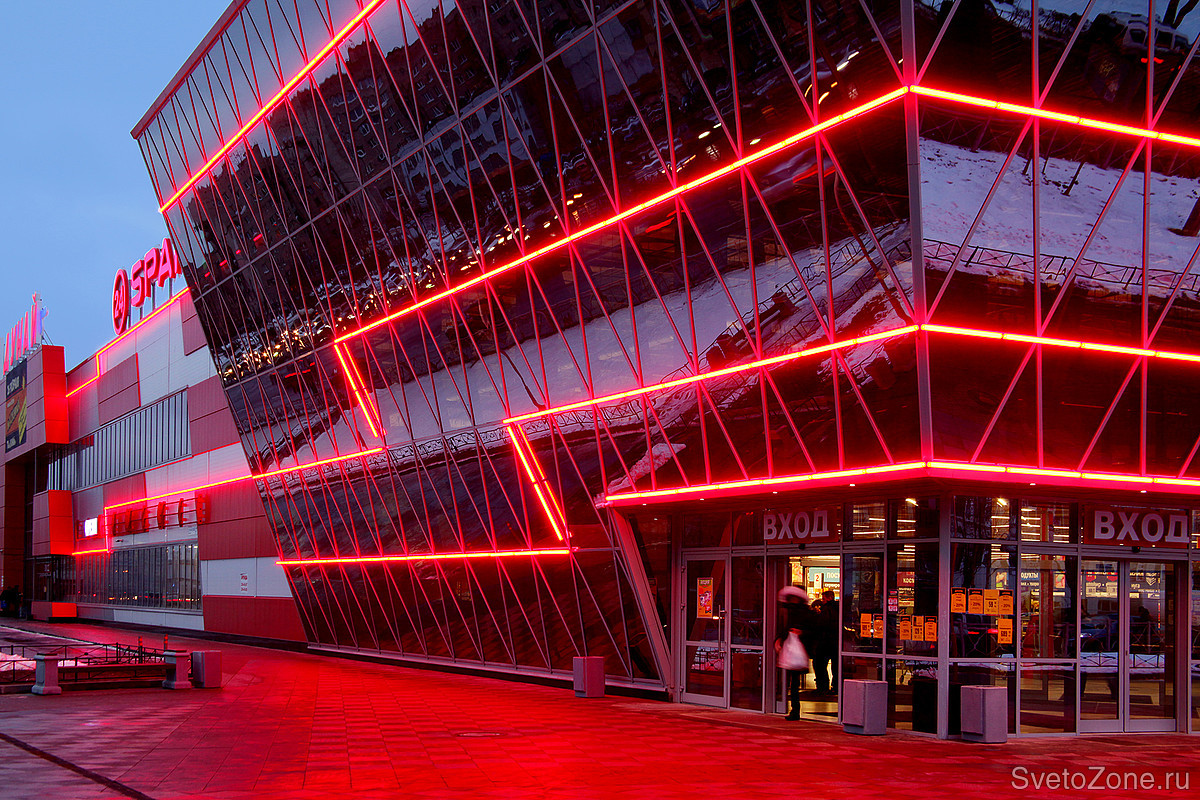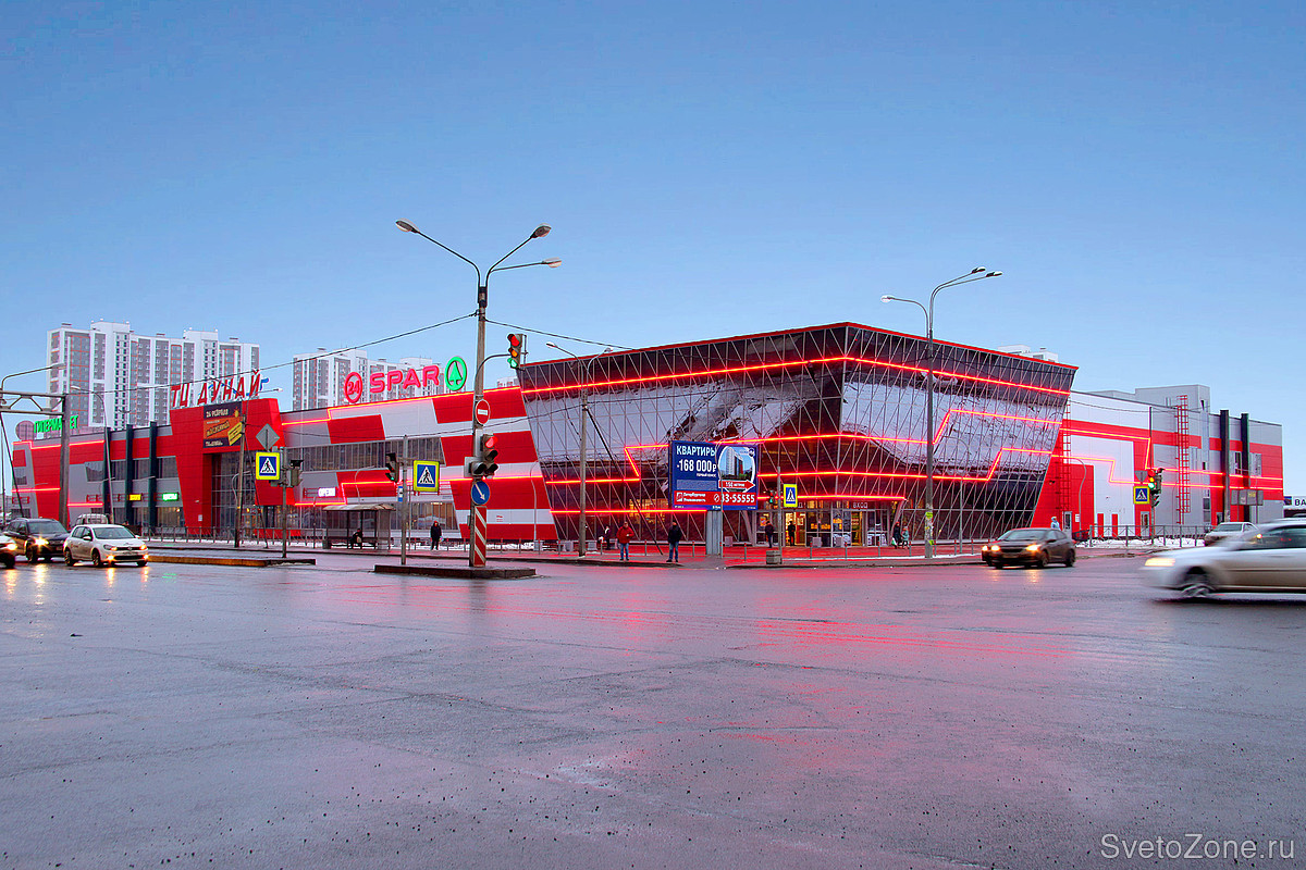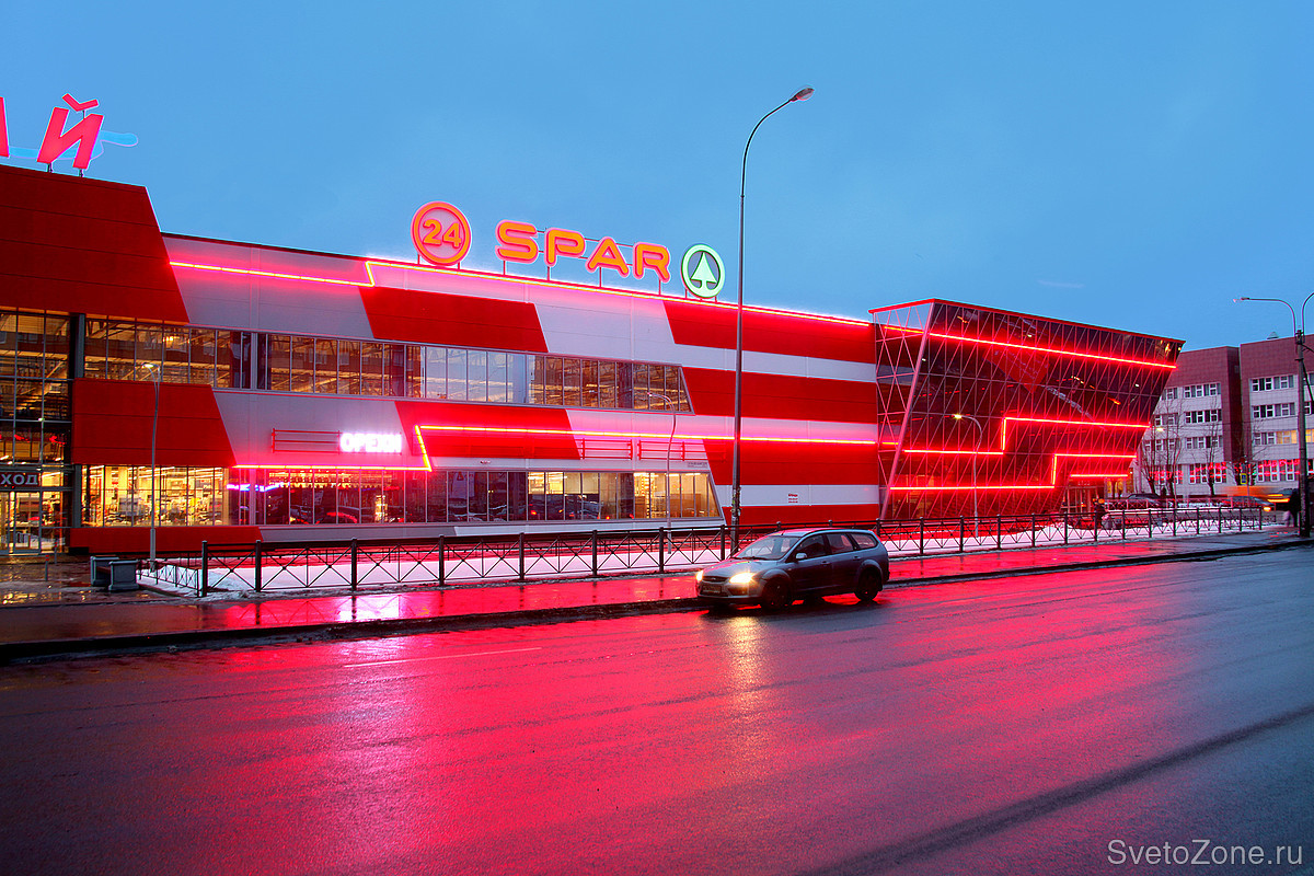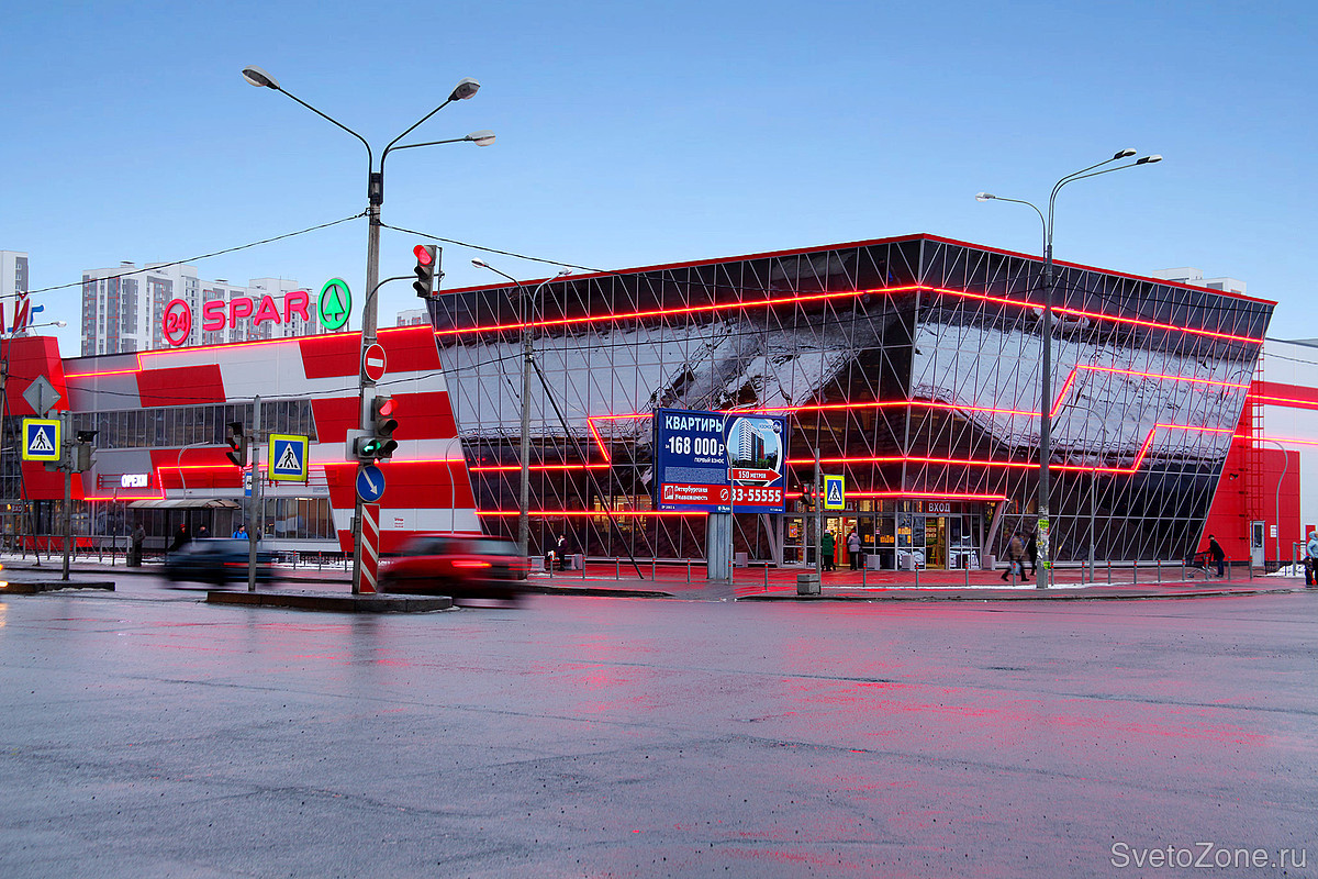 Основу светового решения составляют 450 светильников серии IntiTUBE длиной 100 см, создающие непрерывную ломаную световую линию. Красный цвет был выбран неслучайно: светильники не только поддерживают фирменный цвет сети магазинов SPAR, но и создают эффектный контраст с зеркальной поверхностью фасада. Ряды полуколонн, по три на двух фасадах, локально выделены прожекторами IntiSTARK также красного цвета свечения. Разработка концепции, поставка оборудования, монтаж: компания «Эко Свет Нева» . |