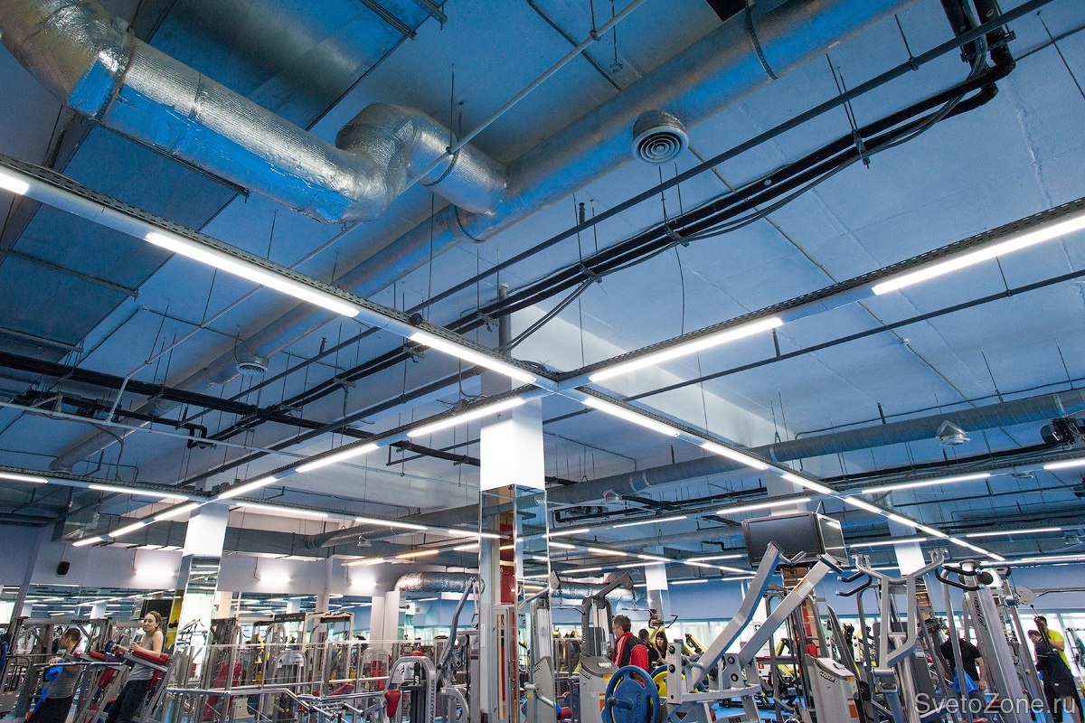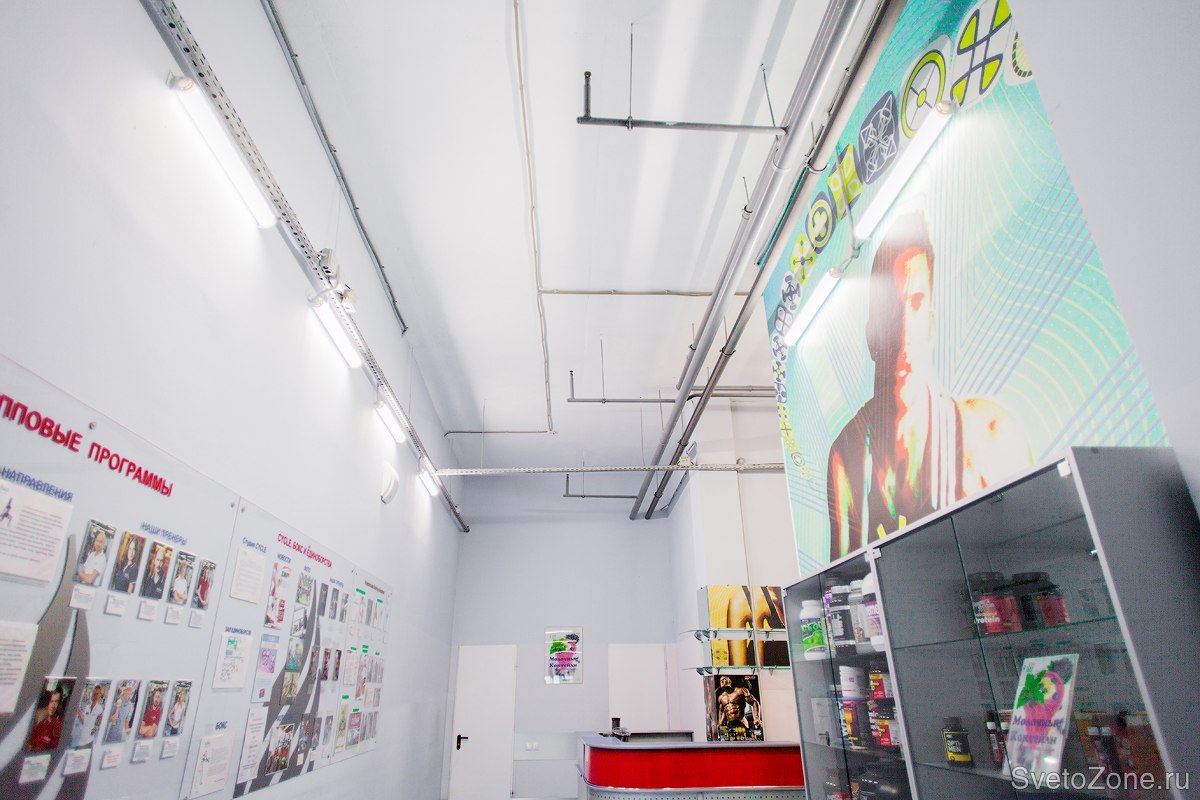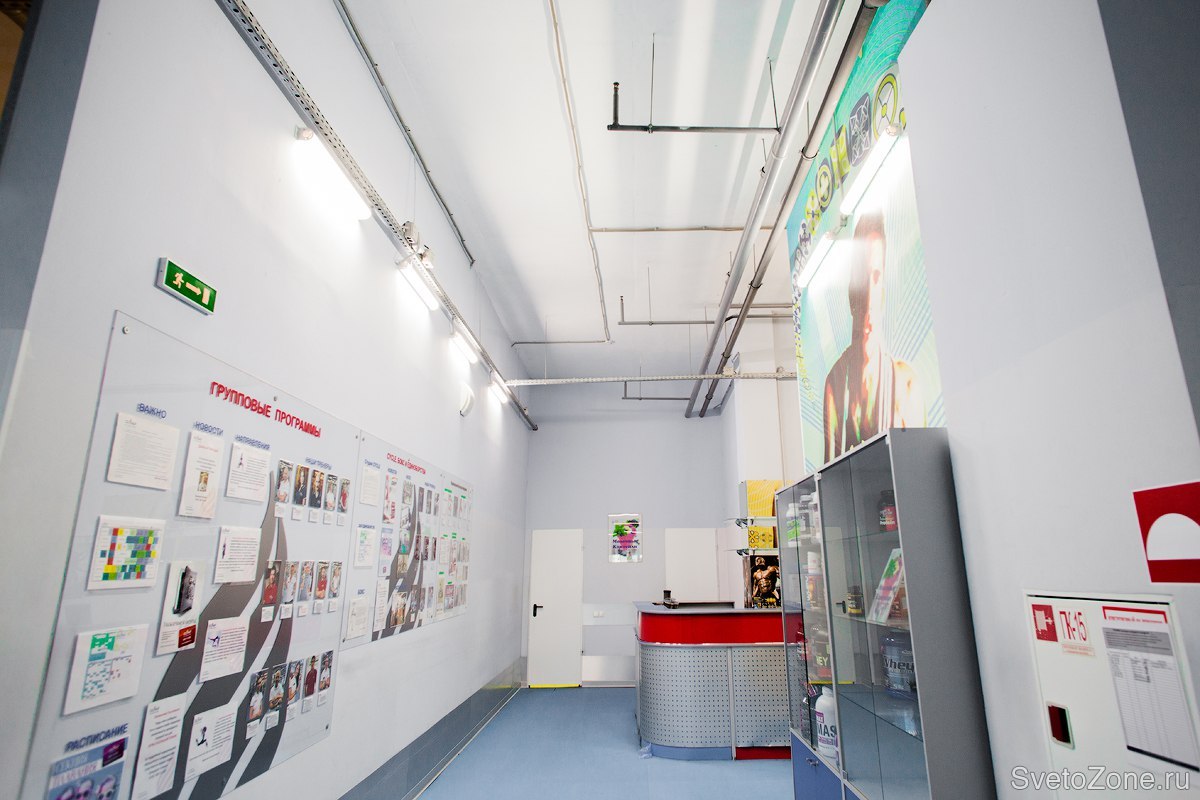 Для освещения зоны рецепции и периметра тренажерного зала был выбран линейный светодиодный светильник FPL 01-24-50 российского завода "ФЕРЕКС".