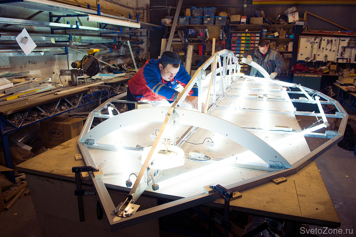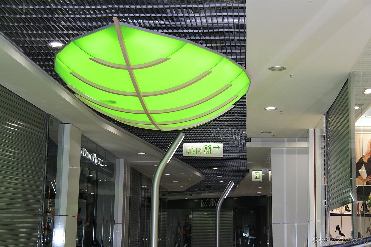 Изготовление светильников в виде листьев для ТРК "Академпарк". Размеры 5000х2000 мм. Источники света - люминесцентные лампы.