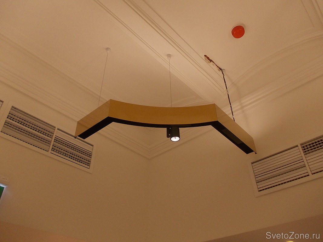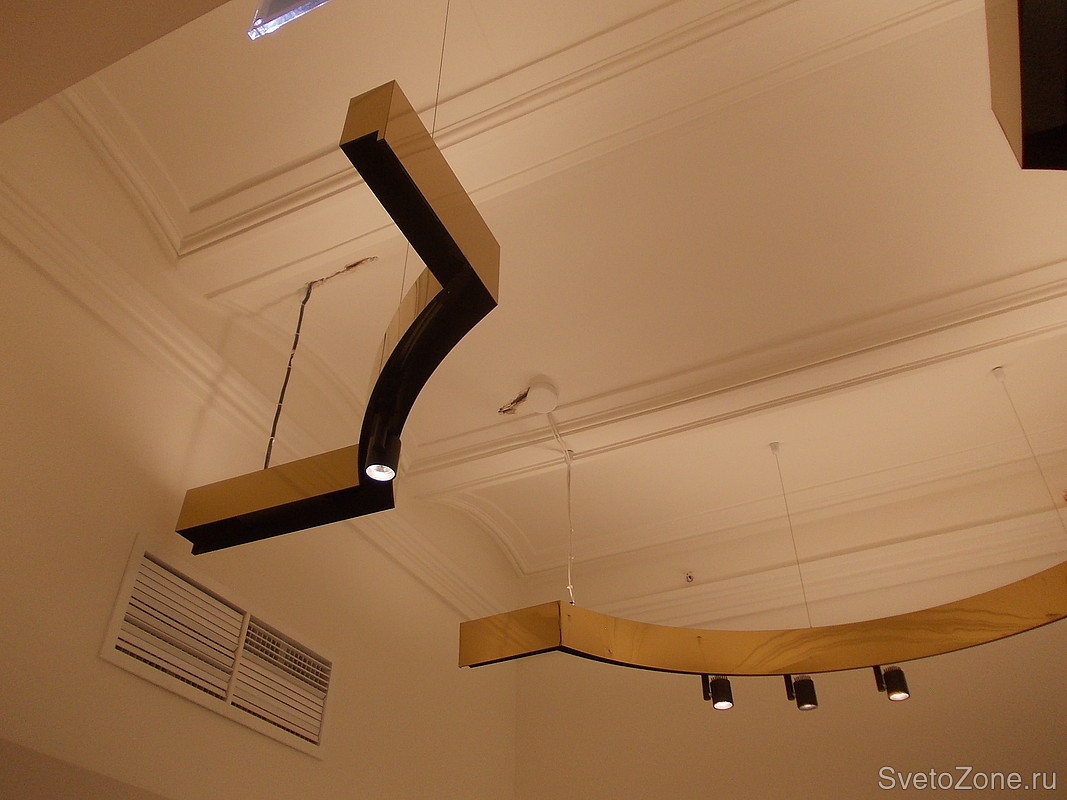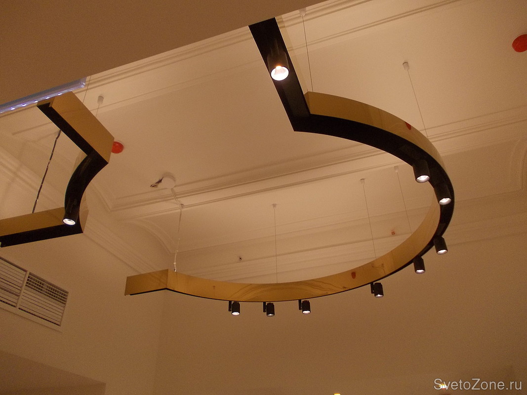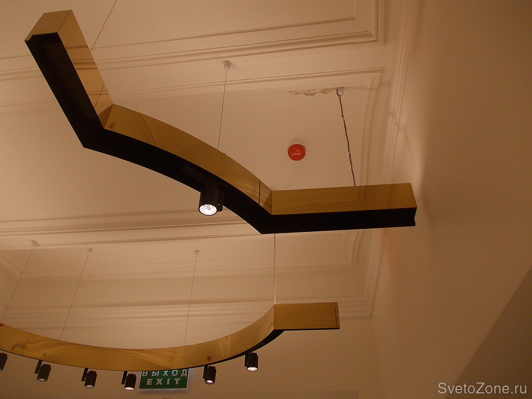 Светильники были изготовлены для салона одежды «Versace Collection» (Москва, Красная площадь 3, ЦУМ). Несущая конструкция облицована зеркальной нержавеющей сталью с покрытием нитрид титана «под золото». Была произведена радиусная гибка шинопровода, на который установлены спотовые светильники для акцентного освещения. Над шинопроводом подвесных светильников смонтирована светодиодная лента для освещения отраженным от потолка светом. |