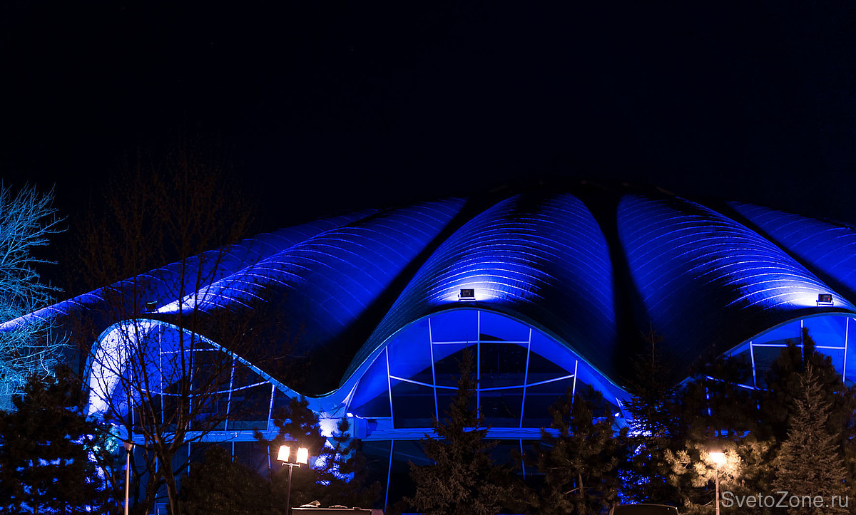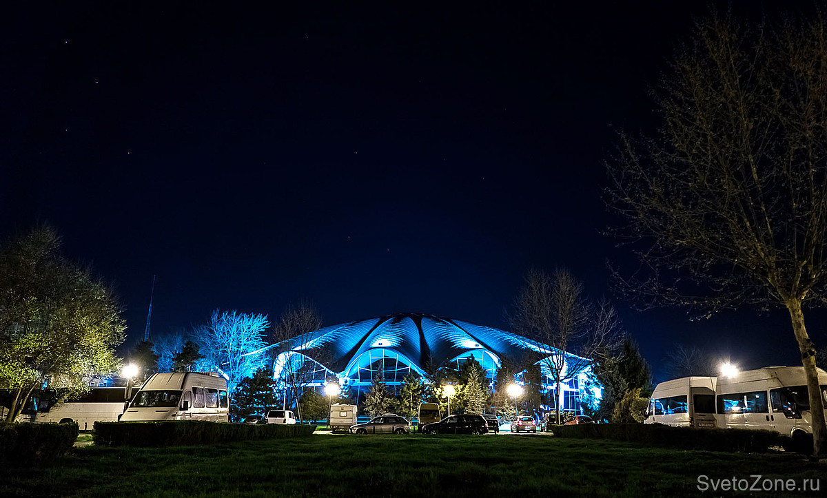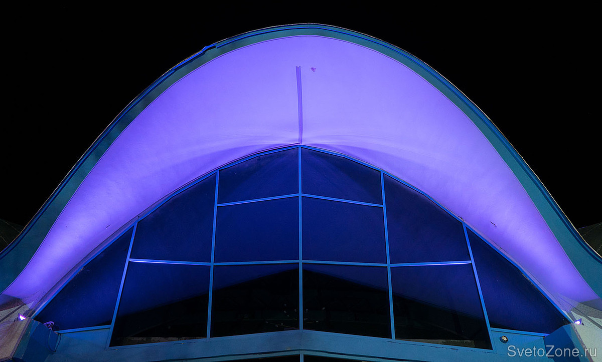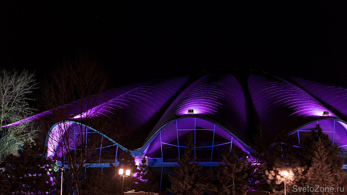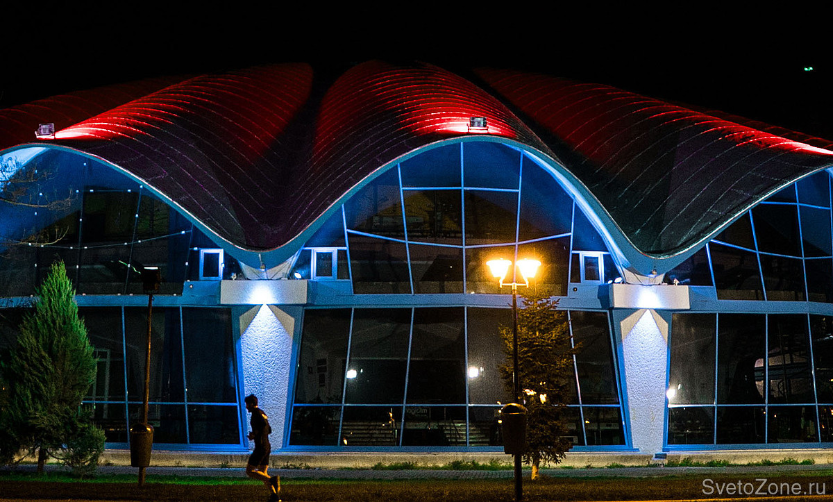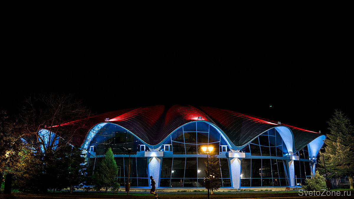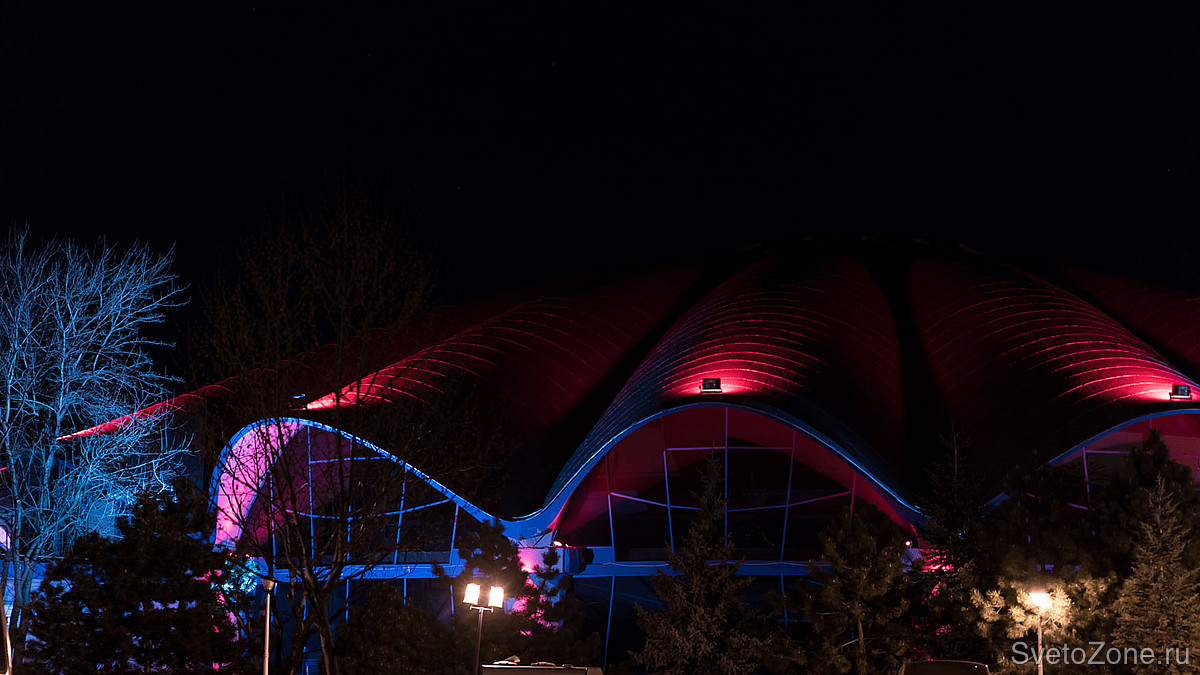 В рамках недавней реконструкции разработана и введена в эксплуатацию новая осветительная установка, спроектированная на основе продукции GRIVEN. В верхних точках каждой из волн крышной конструкции смонтированы мощные цветодинамические прожекторы POWERSHINE MK2 S RGBW, направленные в центр главного купола. Полусферические арки выгодно выделены колорченджерами ZAPHIR, акцентное освещение вертикальных простенков выполнено с использованием компактных светодиодных прожекторов JADE 16 RGBW.
