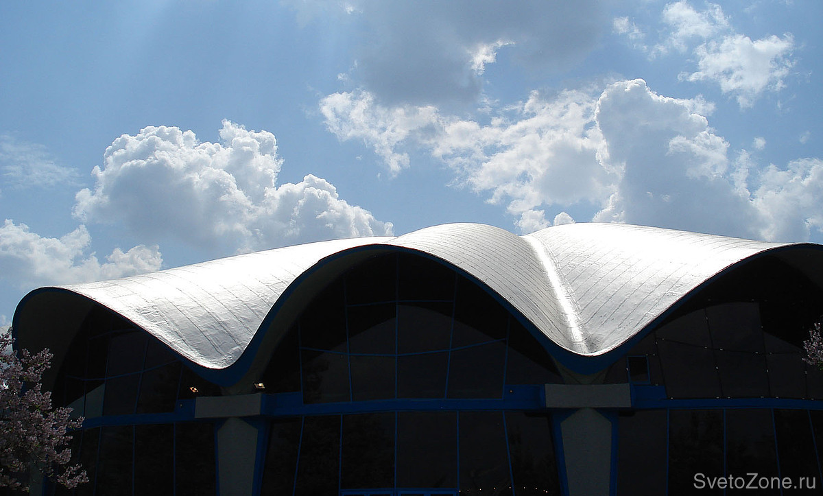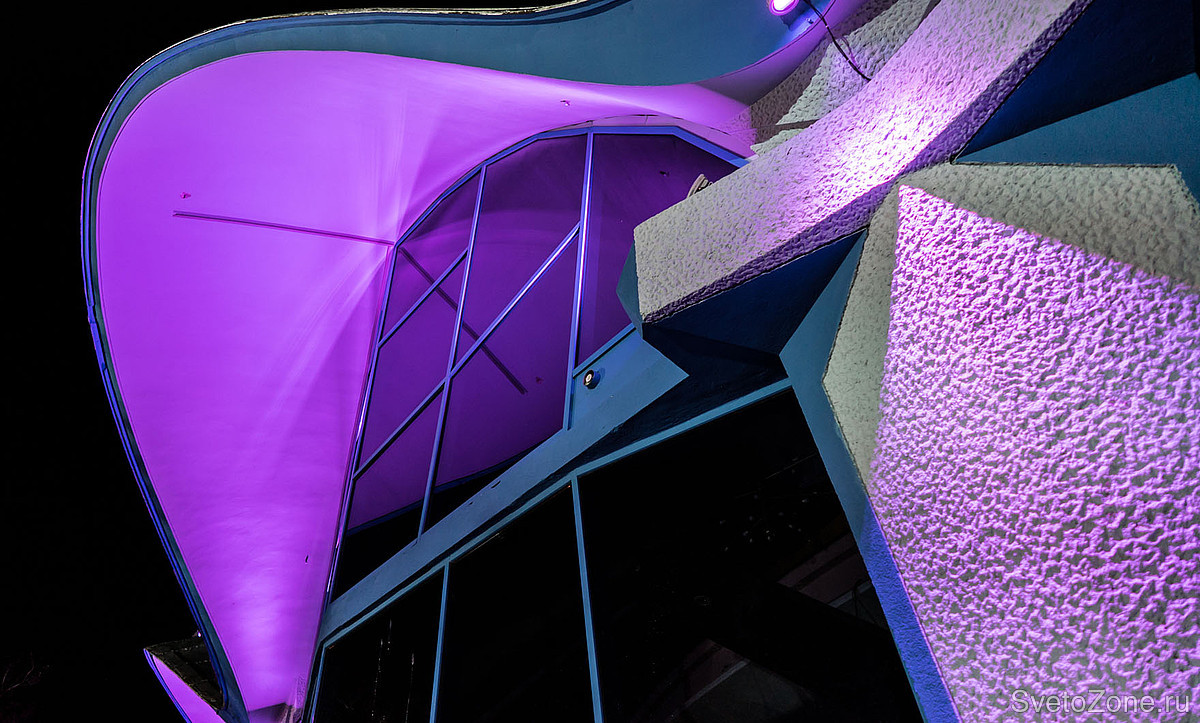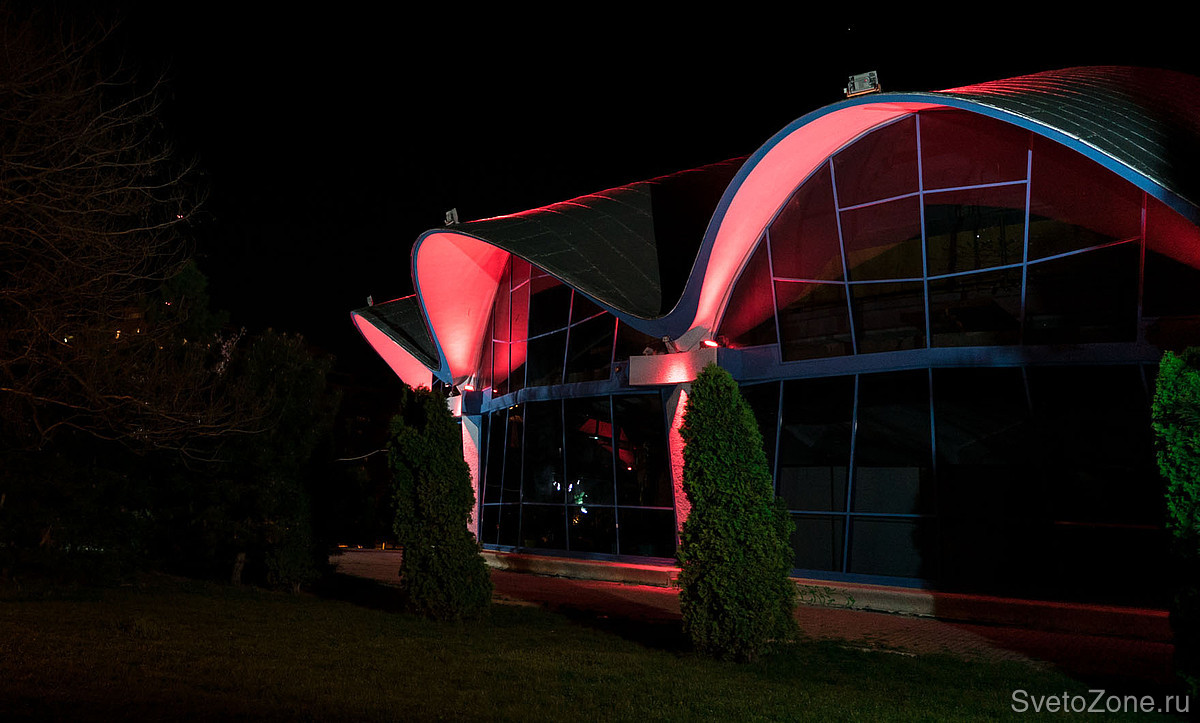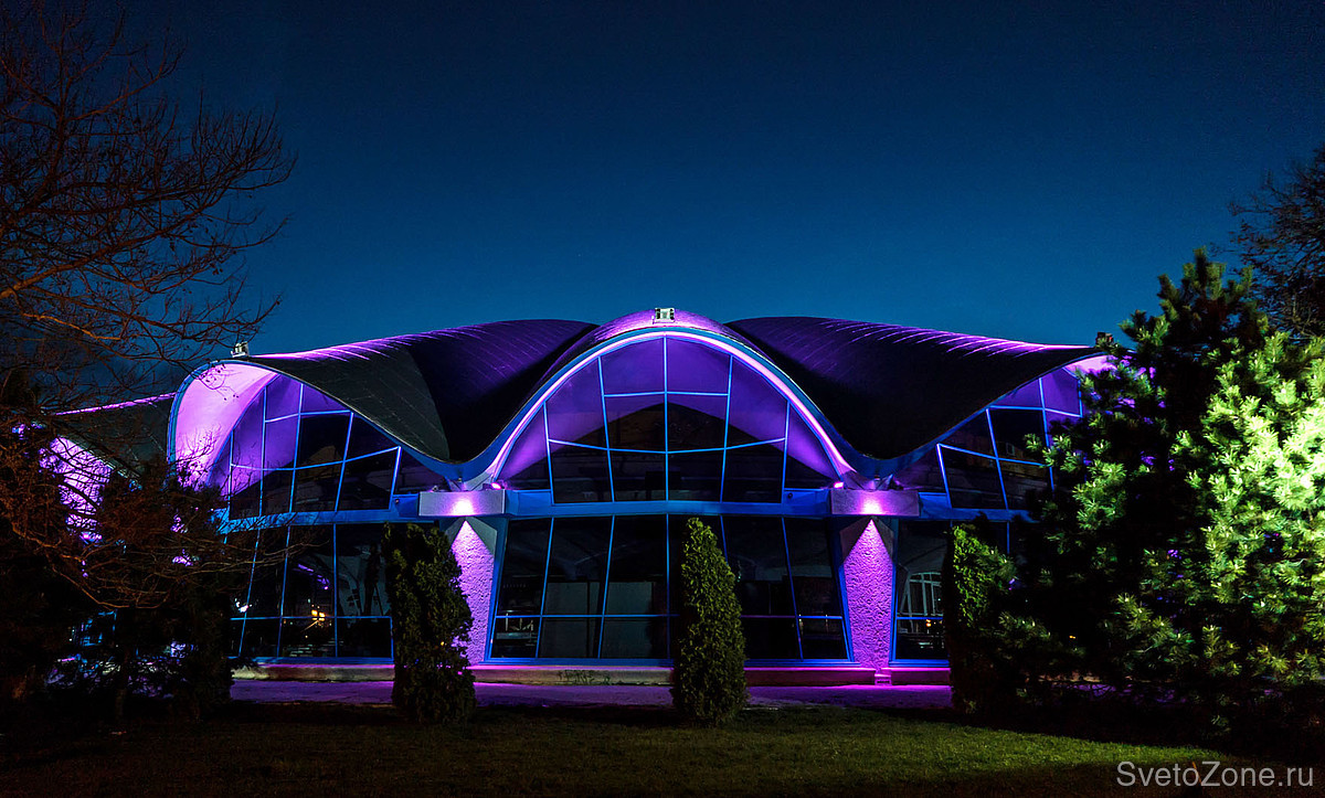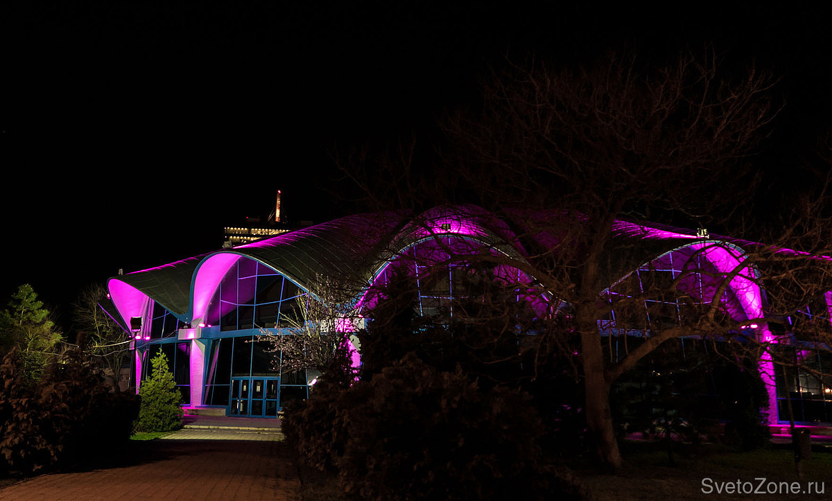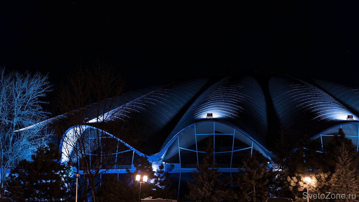 В рамках недавней реконструкции разработана и введена в эксплуатацию новая осветительная установка, спроектированная на основе продукции GRIVEN. В верхних точках каждой из волн крышной конструкции смонтированы мощные цветодинамические прожекторы POWERSHINE MK2 S RGBW, направленные в центр главного купола. Полусферические арки выгодно выделены колорченджерами ZAPHIR, акцентное освещение вертикальных простенков выполнено с использованием компактных светодиодных прожекторов JADE 16 RGBW.