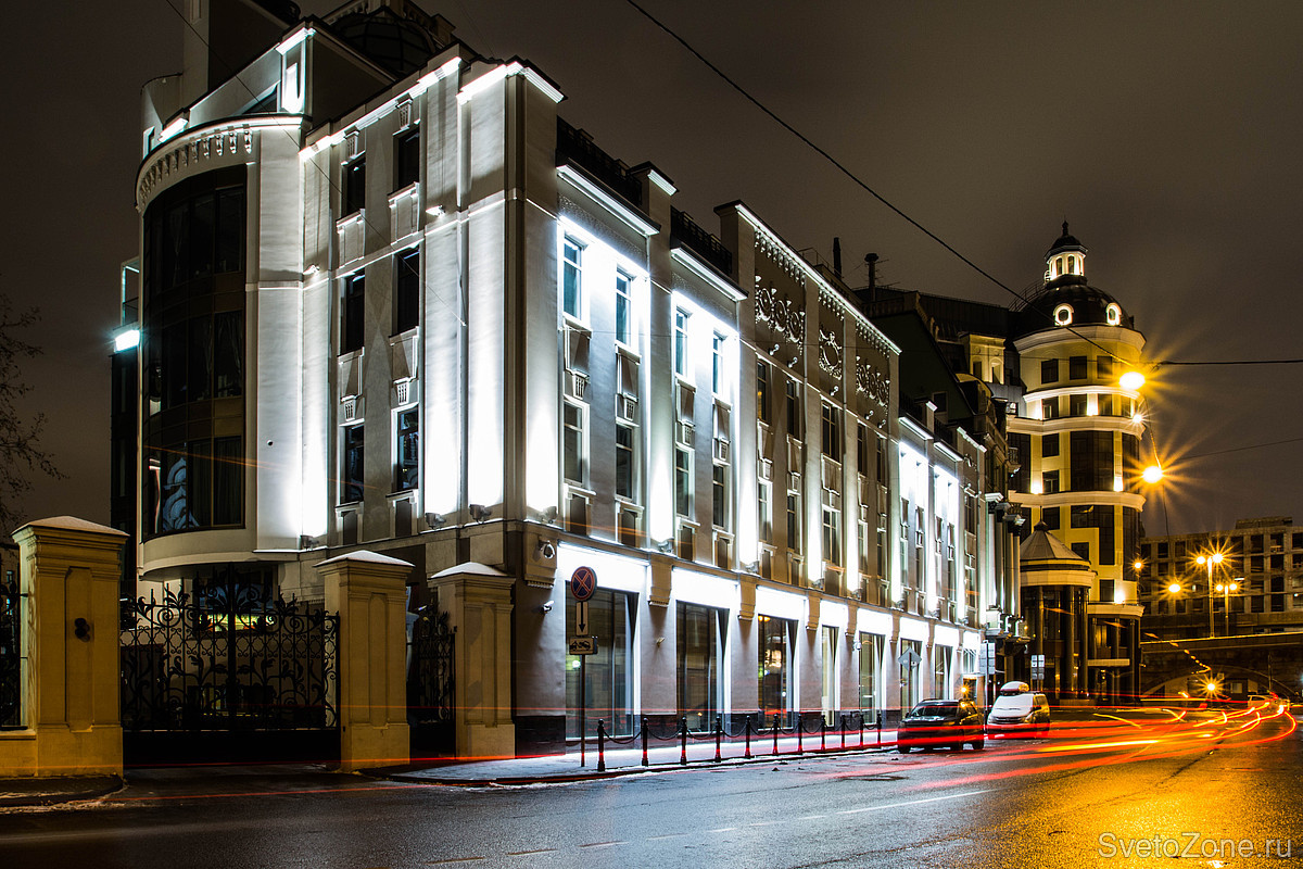 Реализация: Для реализации этого решения были выбраны светодиодные светильники серии IntiLINE холодного белого цвета свечения. Высокая светоотдача, равномерность светового потока и овальная оптика (10х50°) позволила подчеркнуть классический фасад и вписать здание в общий световой рисунок Садовнической улицы. Срок службы светильников не менее 50000 часов.