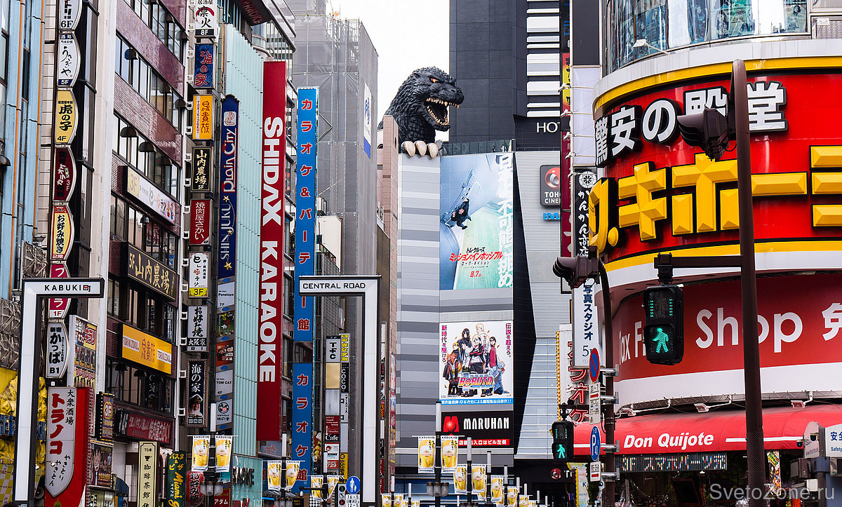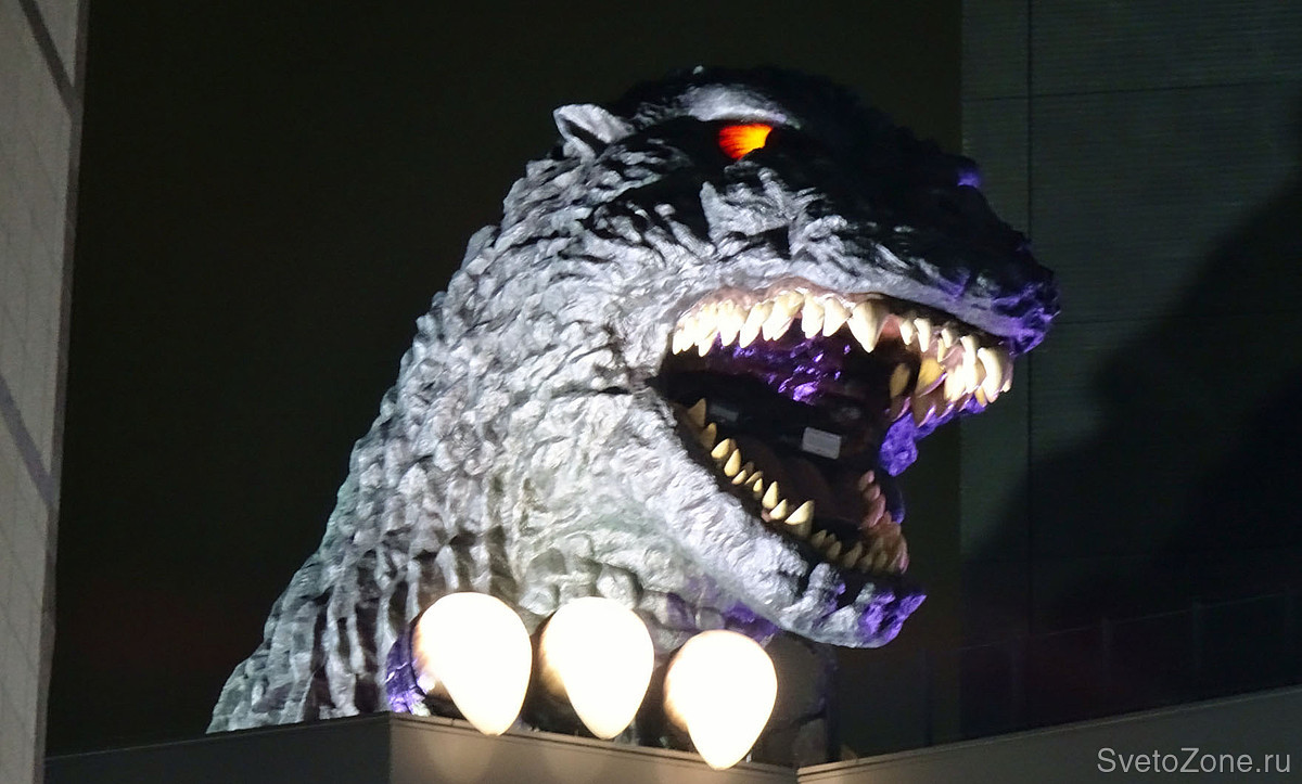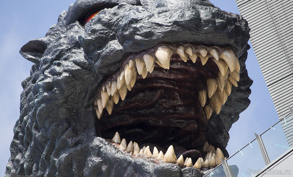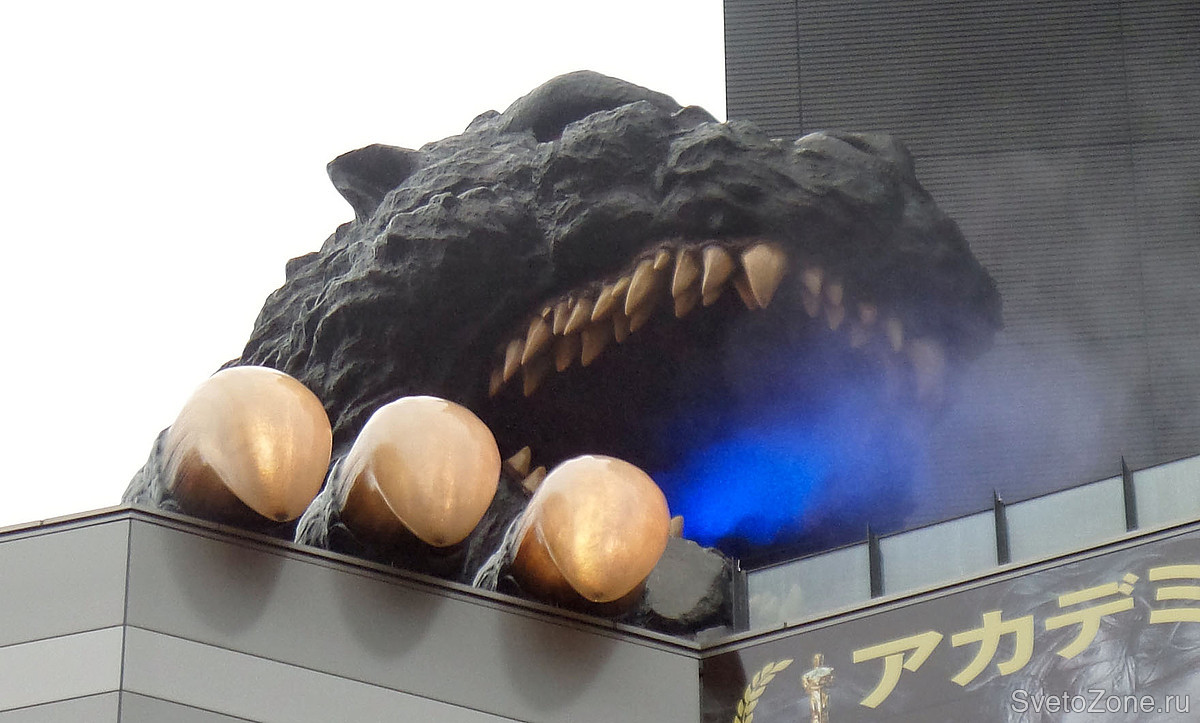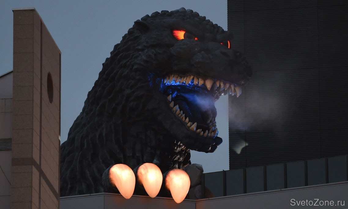 12-метровая реплика головы Годзиллы, выполненная по мотивам фильма 1954 года, смонтирована на высоте 52 метров от уровня земли, закреплена на восьмом этаже гостиницы Hotel Gracery Shinjuku, извергает потоки дыма из раскрытой пасти и свирепо сверкает глазами в темноту ночного города. Окна шести из 970 номеров гостиничного комплекса выходят прямо на голову Годзиллы... очевидно, что постояльцам этим номеров, случайно проснувшимся в ночи, бесплатно предлагаются памперсы (в качестве комплимента от заведения). Лапа чудовища буквально установлена в одном из номеров, в остальных слышны хрип и дыхание зверя.