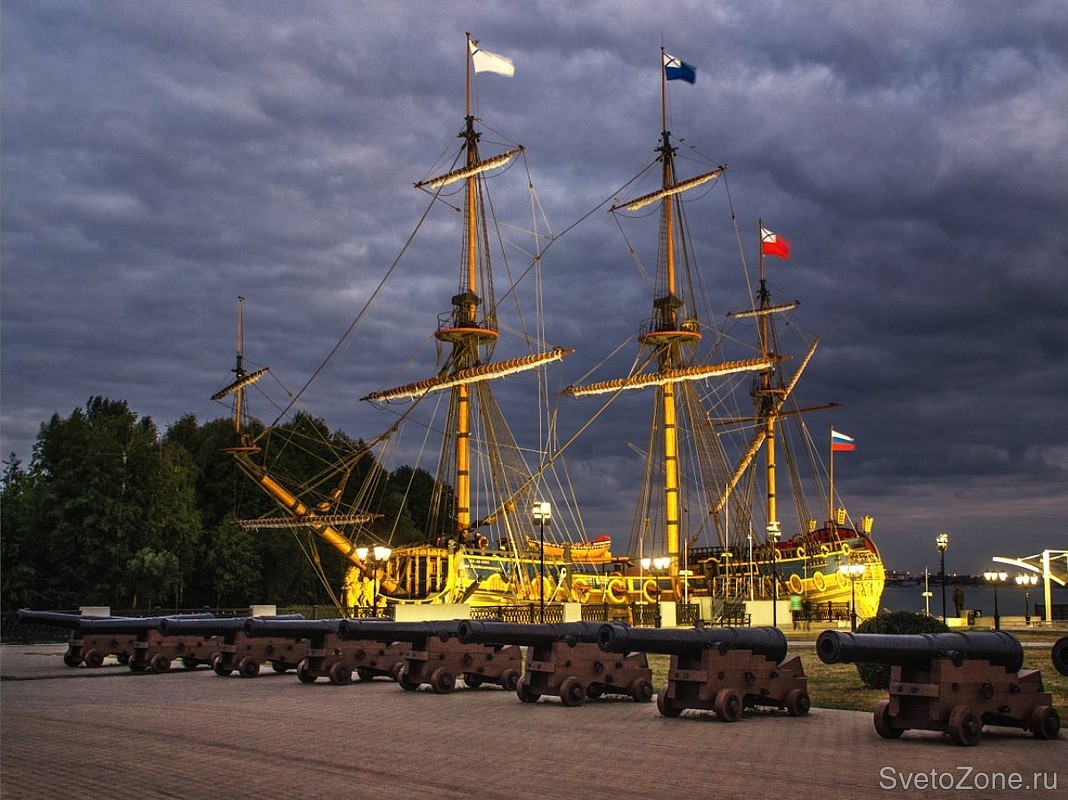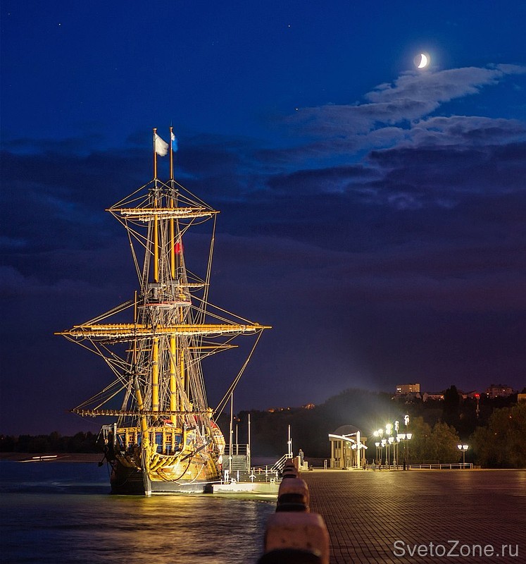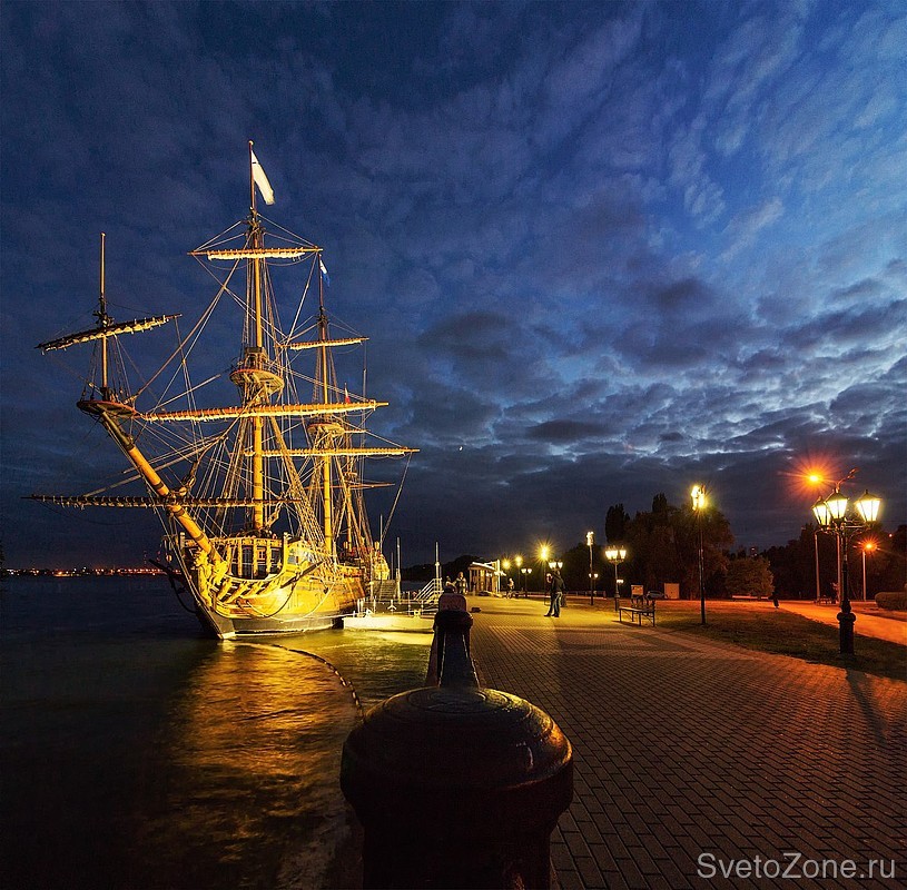 Выполнено акцентирующее точечное заливающее освещение мачт корабля, а так же заливающее освещение основания судна. В проекте используется современное светодиодное оборудование отечественного производства.